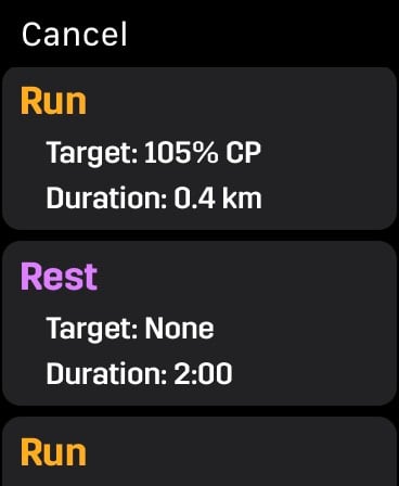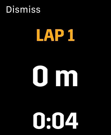 – Limited data display elements from which to choose. Biggest miss for me is the lack of current split (segment in Apple-speak) running time. For example, I like to take a quick peak at the 400M mark to see if I’m on track for my 800 intervals. Not possible with AW.