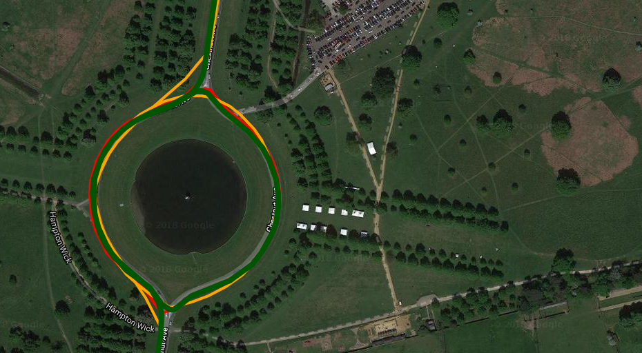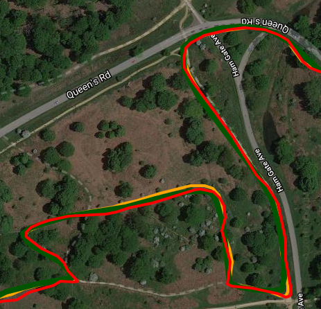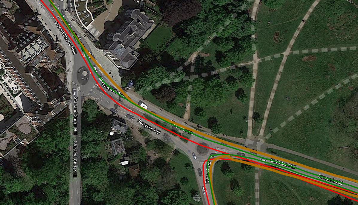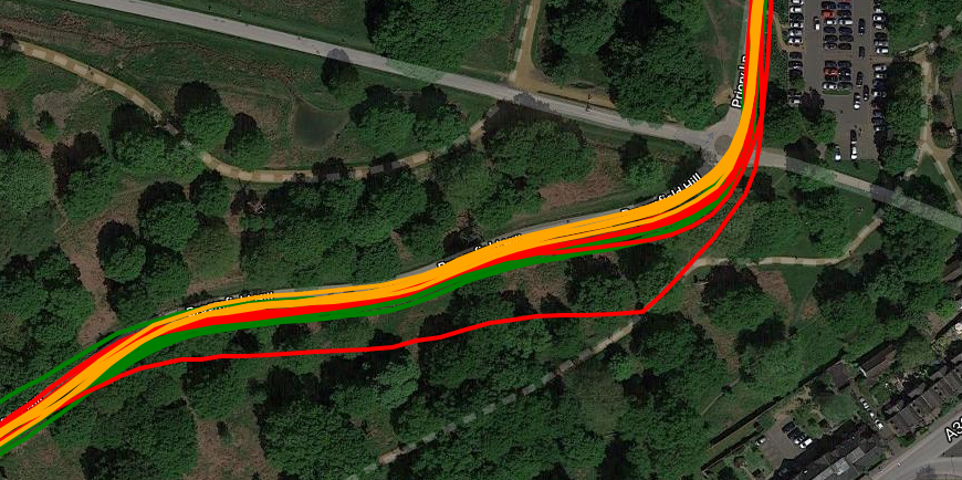Here is the same junction on a different day and from a different direction but this time using the STRAVA app to record the track (which DOES affect the apparent GPS accuracy). There were 5 passes here and all but one of the passes is fine for the Apple watch. Indeed on the entire 40+ mile ride, this was the only area of any concern.