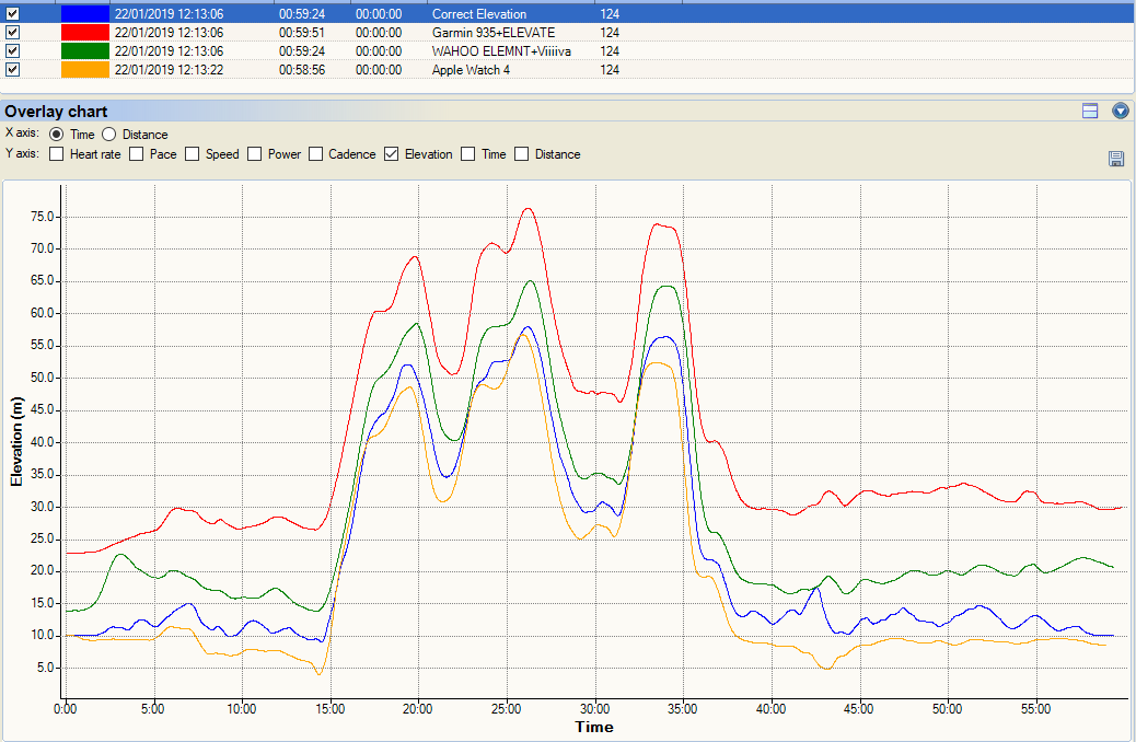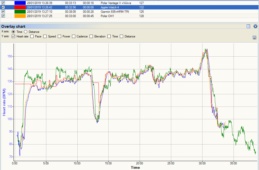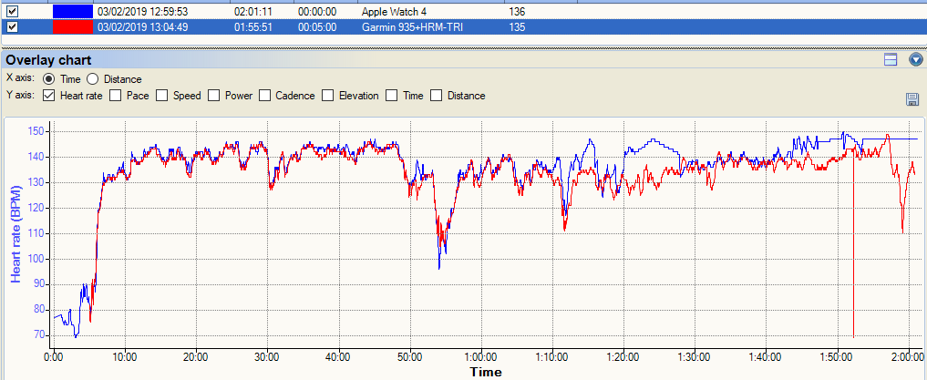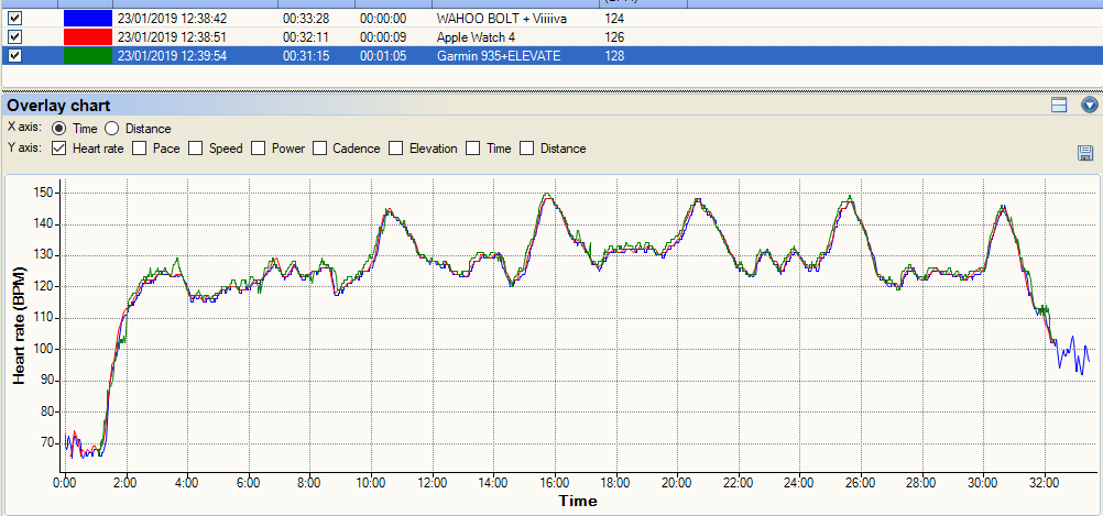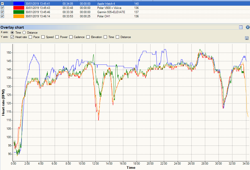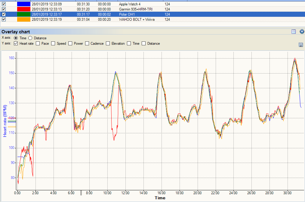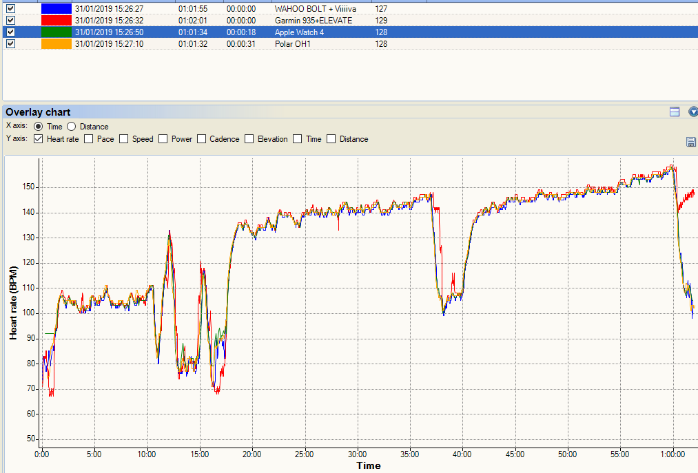 Now this following one is pretty cool. I did 2-4-6-4-2 minute intervals at a not-quite-as-hard-as-I-should level. The Apple Watch nails it and lines up exactly with the Polar OH1. I lost the data from my HRM-TRI chest strap but as the two optical tracks line-up, they are almost certainly correct. The weird thing is the Garmin 935’s ELEVATE sensor results. By themselves, you would probably accept the Garmin data as plausibly correct but the Garmin is clearly wrong when compared to the other two. Very, very strange.