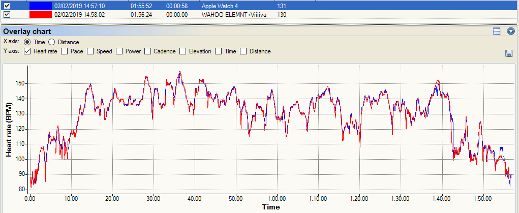 Here we have a slightly longer Z2 ride. The Apple Watch tracks almost perfectly to the Viiiiva chest strap. At the zoomed-out-level, you can see below that the AW4 appears perfect. Suspiciously so. But I am positive that the Apple Watch has not paired in some way to the Viiiva or OH1 and is using its own oHR. Indeed if you zoom in on any of the peaks and troughs you will find that the Apple Watch doesn’t quite find the lows of the troughs and very slightly over-eggs the peaks. However those criticisms are minuscule, this really is as perfect a track as I have ever seen from an oHR device on a ride like this. This is entirely usable IMHO.