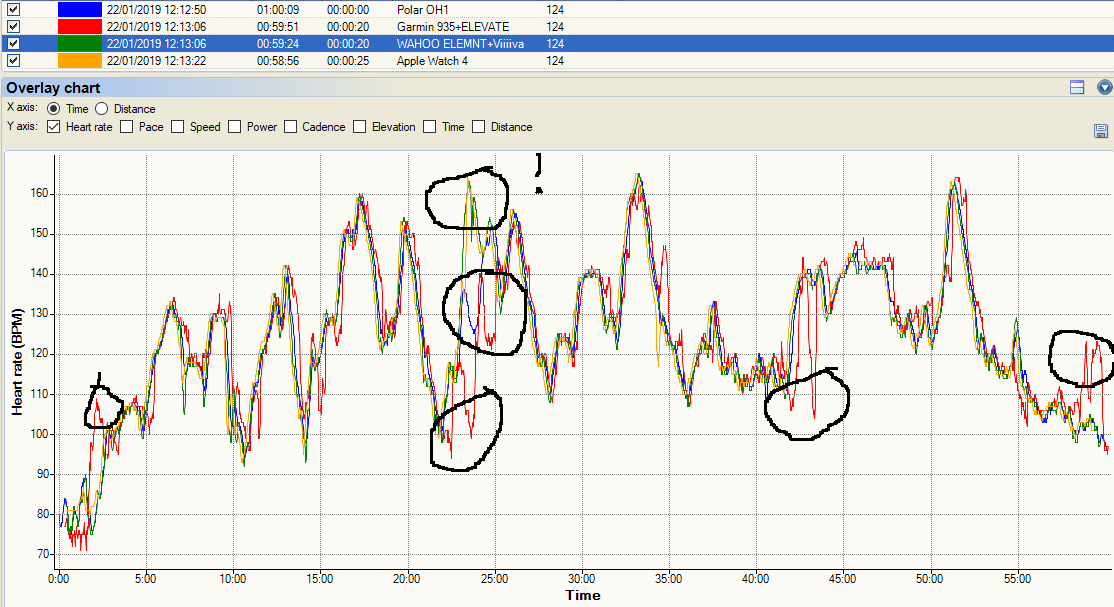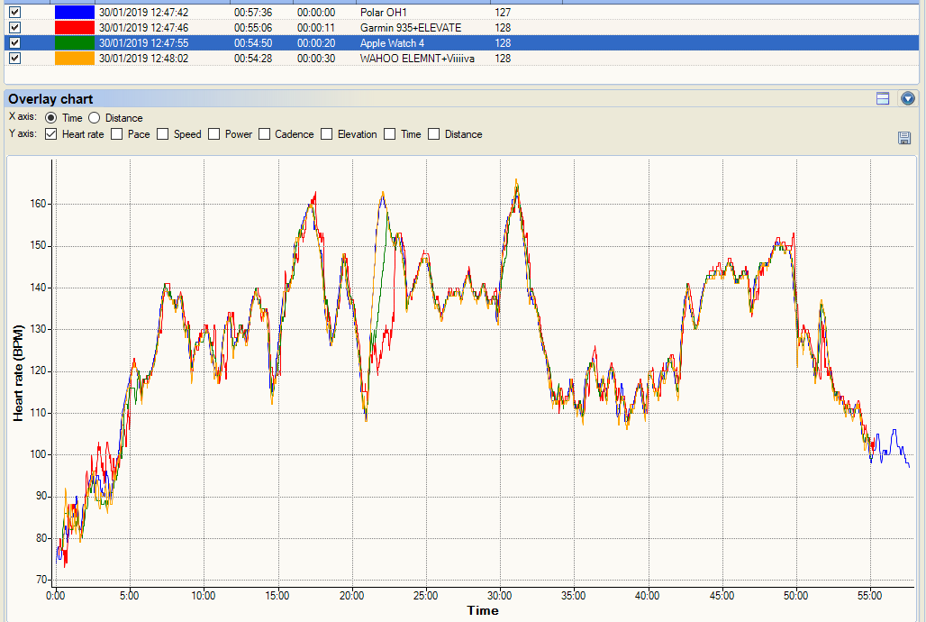 Finally a fully illustrative track. The Apple Watch takes a while to get cadence lock after an hour (but is still rubbish). Again at 35 minutes, it makes a half-hearted attempt at cadence-lock. Garmin’s ELEVATE sensor throws the toys out of the pram also after 35 minutes. Whereas upper arm-based oHR from Polar’s OH1 is a perfect match to a decent chest strap. That, my dear friends, nicely sums up what you can expect from oHR.