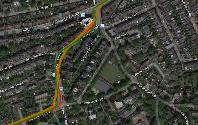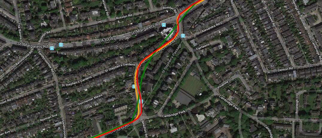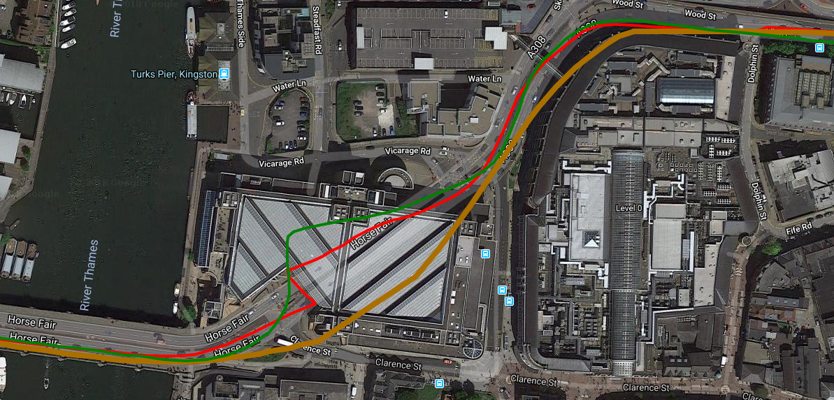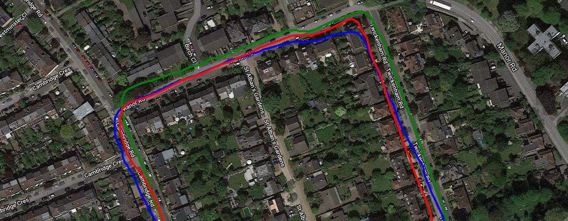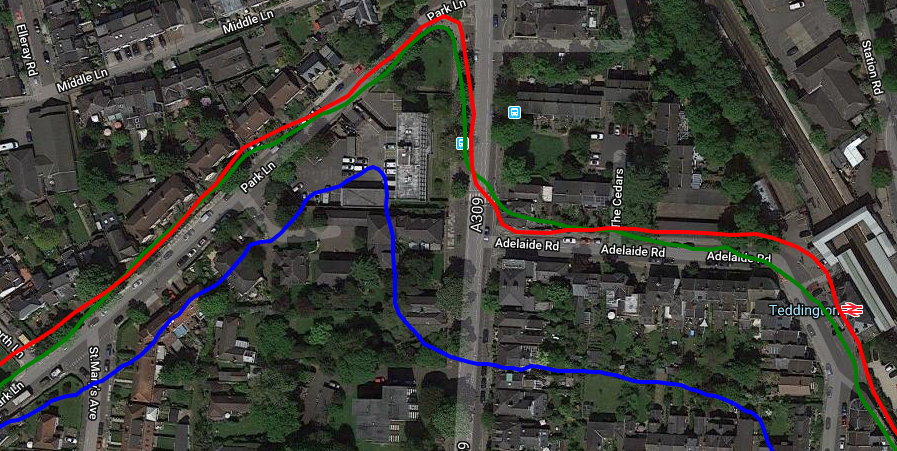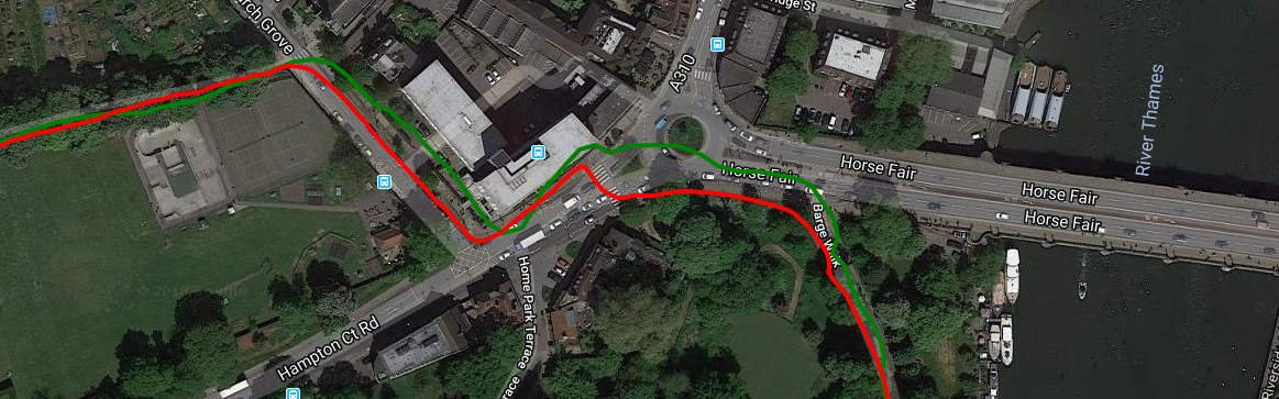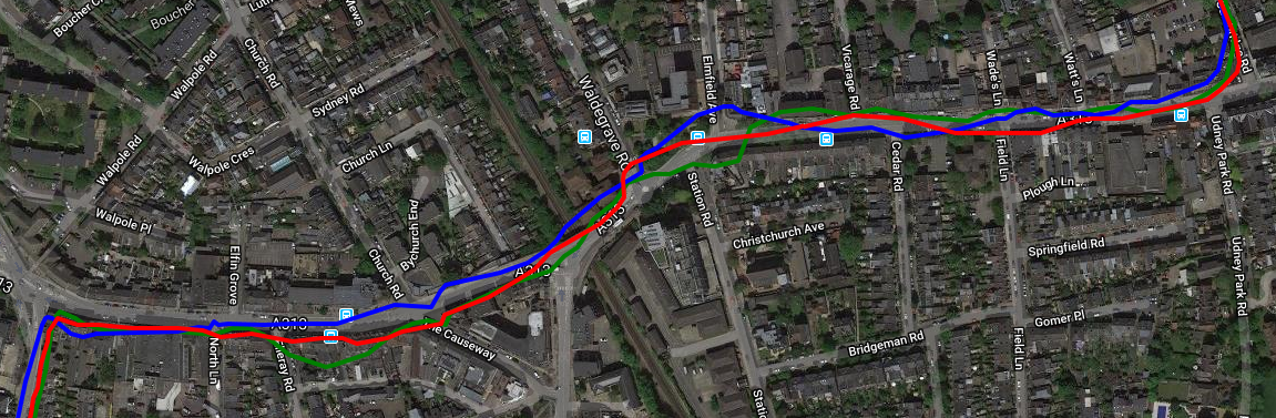To the left of the image I was close to the shops on the Southside of the street and to the right of the image I crossed over and was on the Northside. The Apple Watch *IS* smoothing the track relatively well BUT, as you can see, there is no magic solution to the issue of GPS signals either (a) being obstructed by proximity to a building and (b) being bounced off the building and thus appearing to be coming from somewhere else. Both these two factors will ALWAYS give you GPS track issues. Indeed the interesting section is in the very middle in the open sky where the Garmin and Polar are both confused as the GPS signals are no longer being bounced off buildings. To be fair to Polar and Garmin here, the Apple MIGHT be using GLONASS and/or GALILEO and I find that sometimes helps in conditions of close proximity to buildings.