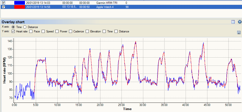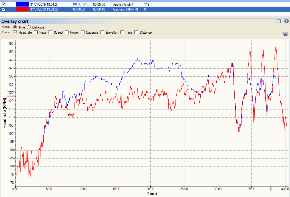 The readability & visibility of the following oHR track is somewhat impaired by the poor Garmin track (Green). However, the Apple track (red) is not as good here as with some of its other efforts with me. The results clearly show a poor reading when I briefly stopped jogging at 13 minutes. Perhaps, more importantly, the Apple Watch does correctly track the sharp oHR drop towards the end. I would say that this track is just about usable for my purposes.
