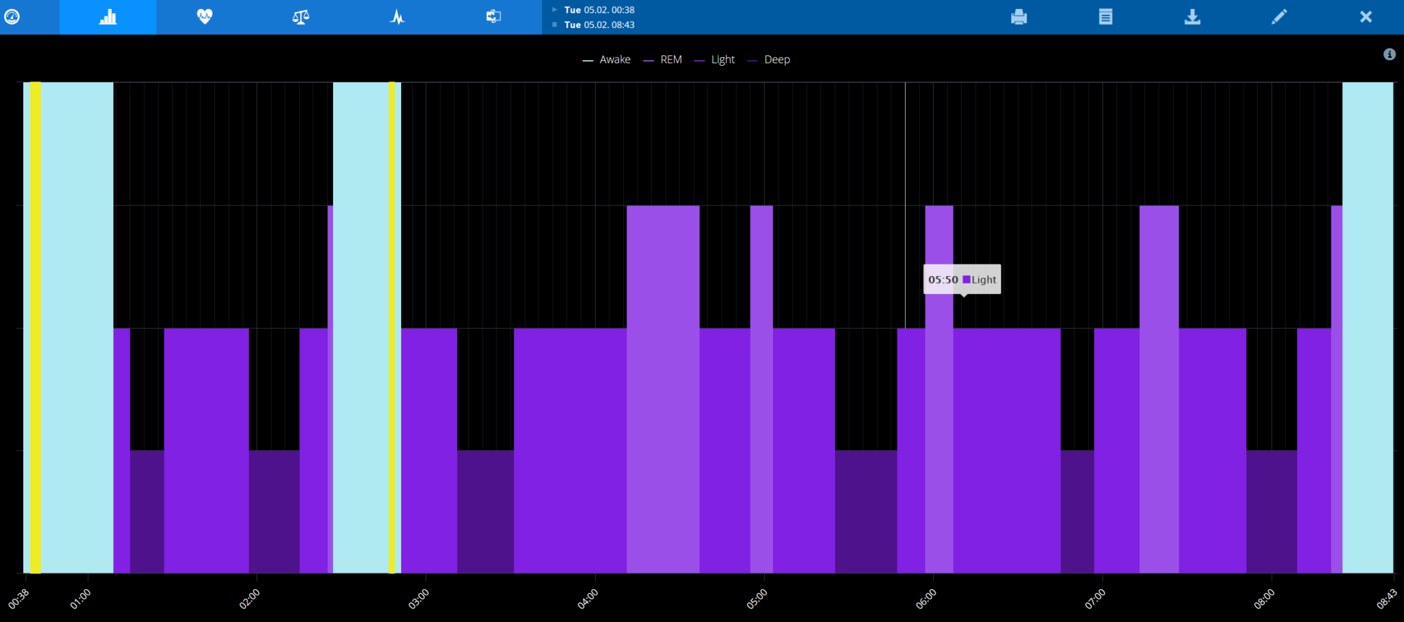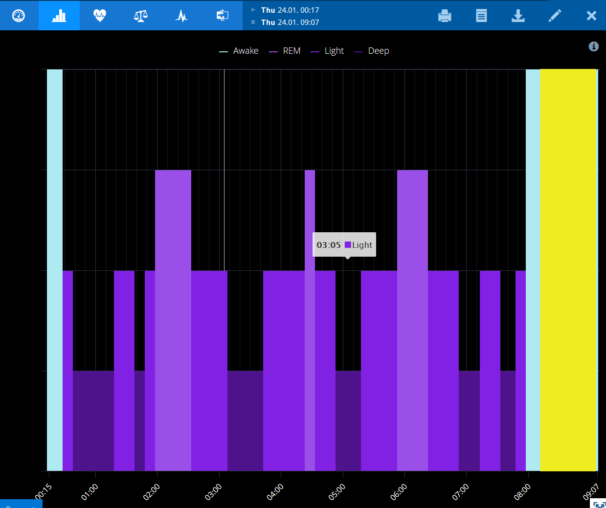 This seems to me to be the right data that people REMAIN interested in after a few months of use. When you first get the sleep tech you agonise about why your heart rate was low for 15 minutes at 4:15 in the morning and then wonder why it is so high at 11:45 most Friday night’s. When the embarrassing realisation kicks in, you quickly turn your attention to other aspects of your night’s activity.