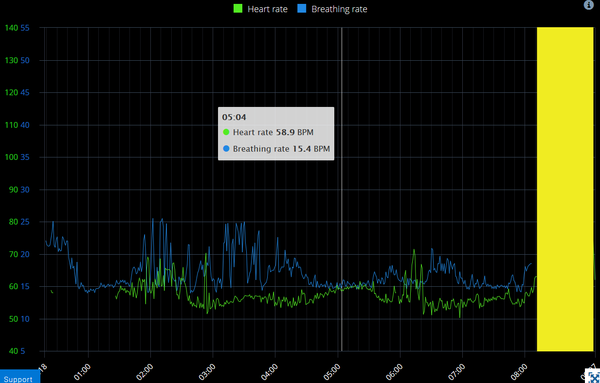 I’ve left this summary chart in from EMFIT as it gives the ‘green box’ of the ideal amount of each sleep stage to have on any one night, you can easily see that this night was lacking in REM sleep but had plenty of restorative DEEP sleep. EMFIT has a whole host of these summaries of different aspects of your sleep and y ou can then drill down into the second-by-second detail if that is your thing.
