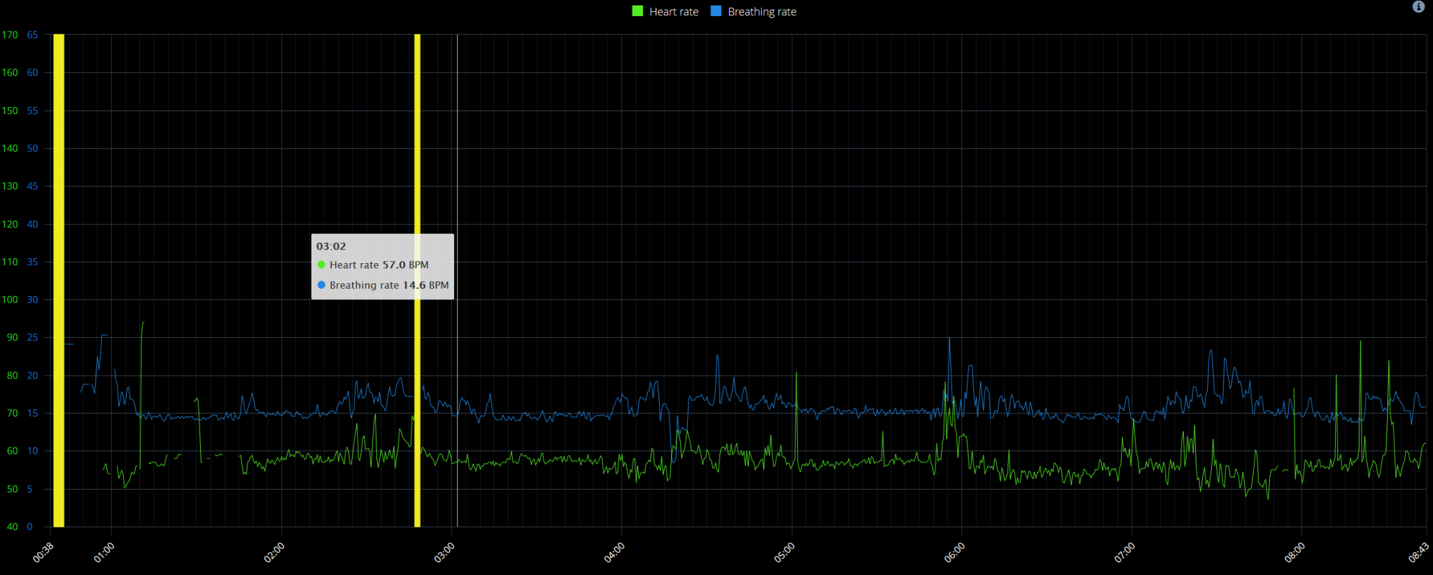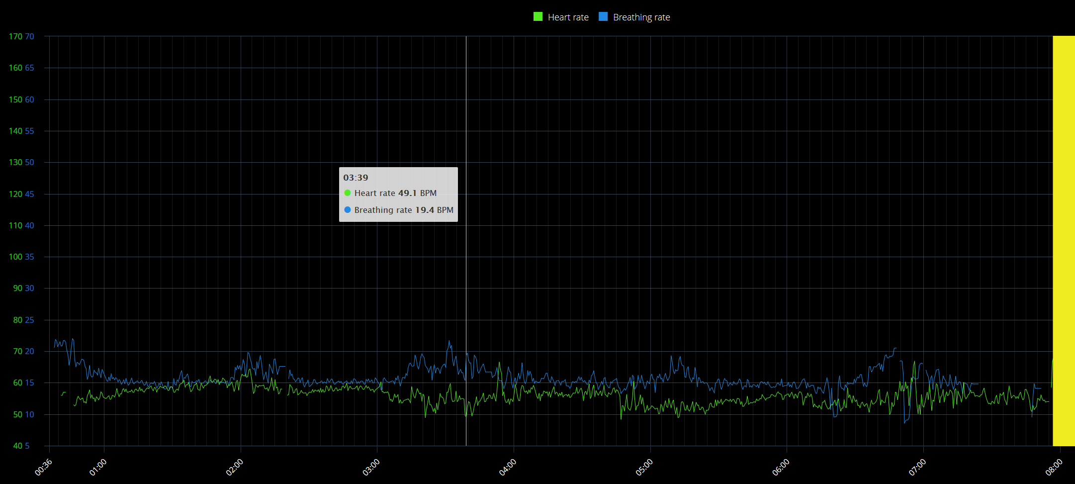 For the same night, you can also track your HR. Withings SLEEP is clearly smoothing the data more, whereas EMFIT is more of a ‘detailed data’ product and so is giving every twist and turn of the curve for a likely different intended user. IIRC EMFIT captures data every 5 seconds or so. These charts look fairly similar to me at first sight.