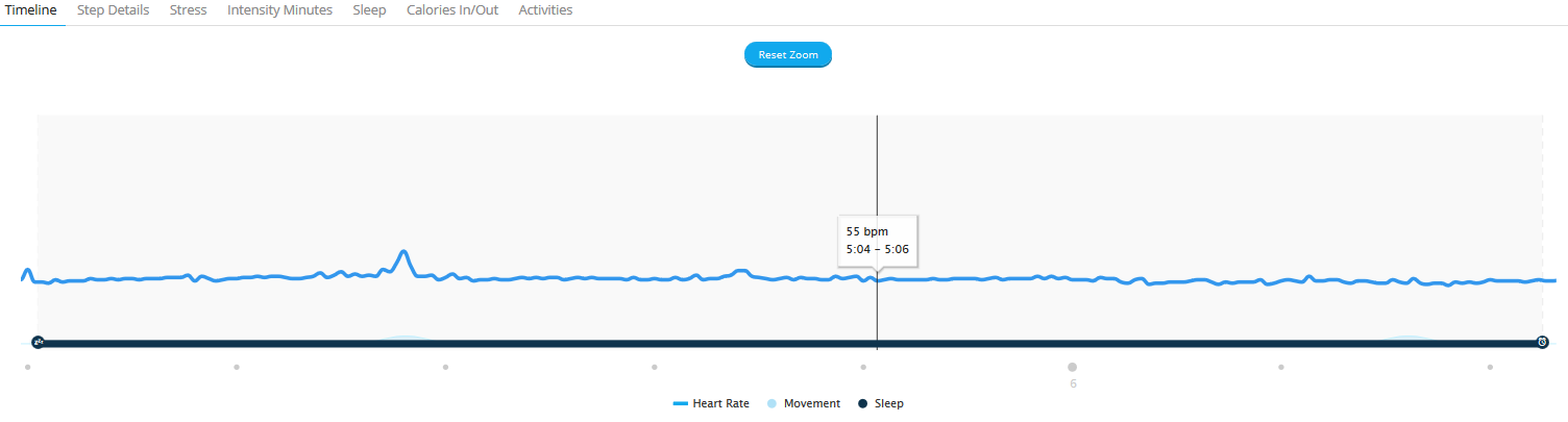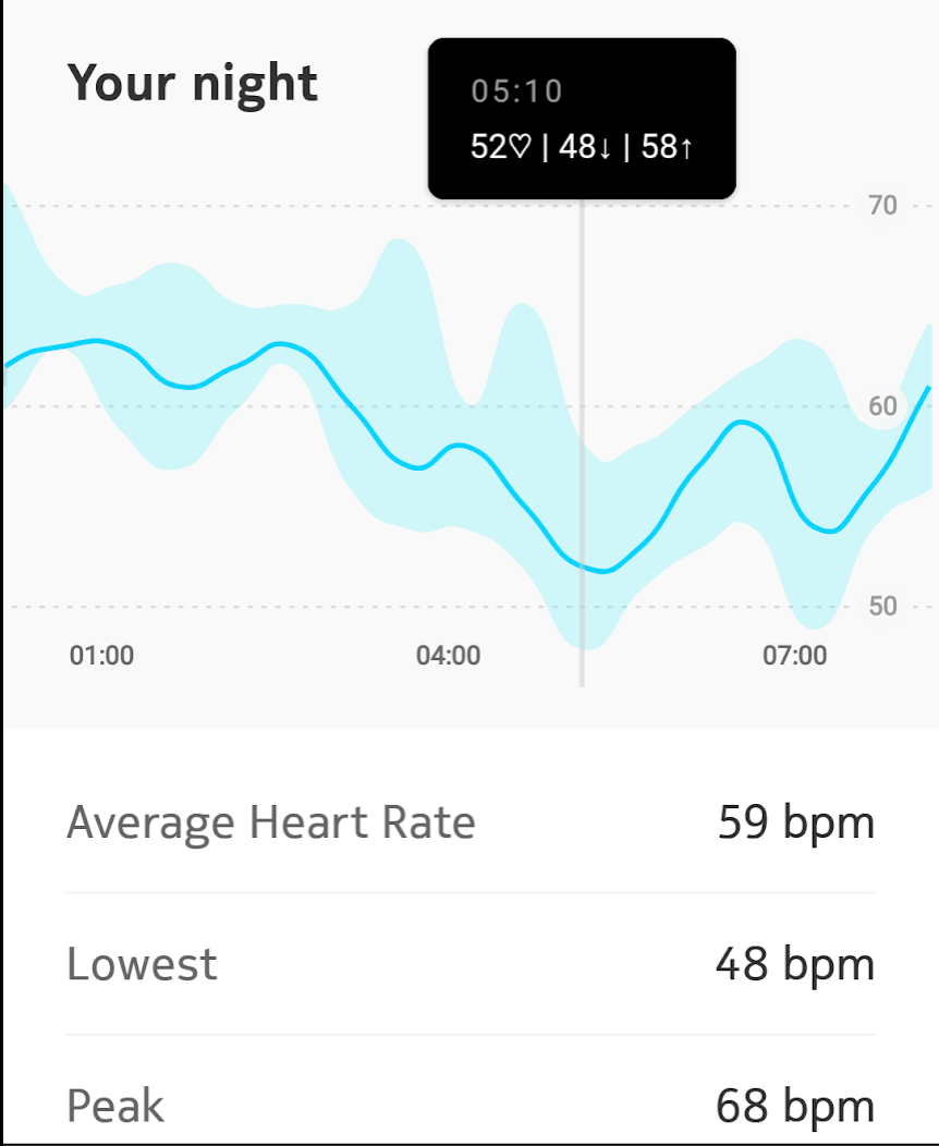 Again the resting HR track is not dissimilar on first sight. However looking at the one data point I highlighted at 03:00 AM you can see there may be a couple of bpm difference.
