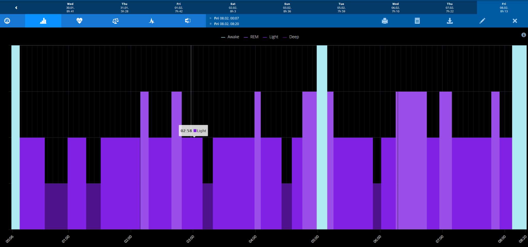 Yes, after a while you just want to see that headline figure…78% and it seems to tie in with your view on whether or not you had a good nights sleep (kinda makes the tech somewhat redundant but it’s nice to have a log of these things). But then the SLEEP STAGE info seems to retain a perpetual fascination. Members of my family all look at this data differently depending on whether or not they are athletic and looking for physical recovery, or studying and hoping for fabled gains from memory consolidation, or perhaps just looking to see at what time of the night the alcohol has worn off.