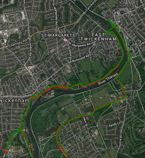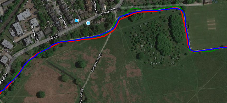Then the third image is a mile or so further on where I crossed the River Thames at Teddington Lock (very pretty), the 245 was the worst of the bunch here (GPS only). Indeed all the tracks are a ‘bit jumpy’ if I had switched to GPS+GALILEO they would probably still be a similar degree of error (aka the same) but the track would look smoother like the Suunto 5, although that is using ‘BEST’ mode which I think is GPS+GLONASS.