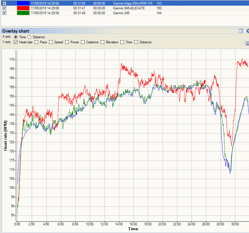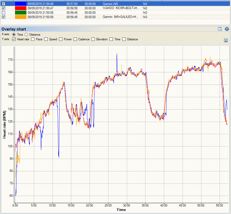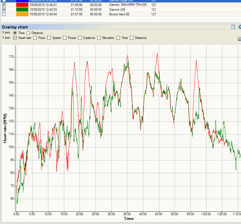 This is not as good, reflecting wrist movements when cycling and movements caused by bumps on the road. The third example is indoor cycling which shows a good track as there is no road noise. These 3 charts are probably typical of what you might expect.