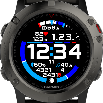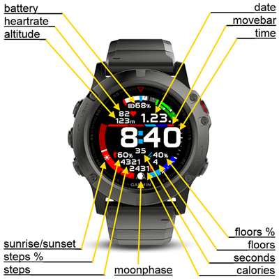 The developer says, “A little experimental watch face. You can see a zoomed view of an analog clock. The largest circle shows a daylight and dawn (you need to start an activity to get a GPS position). The small circle shows a daily steps count and a current heart rate. Three data fields on the side are configurable in settings.”
