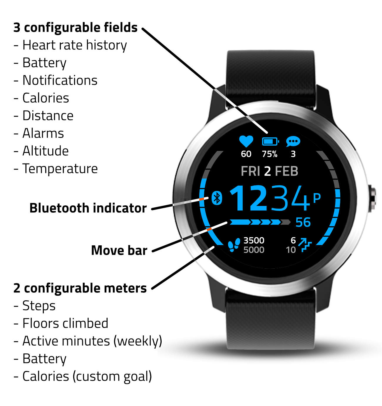 The developer says, “This watch face is all about readability and provide the every day activity tracking info. Very large fonts for all kind of information makes it easy to read.”