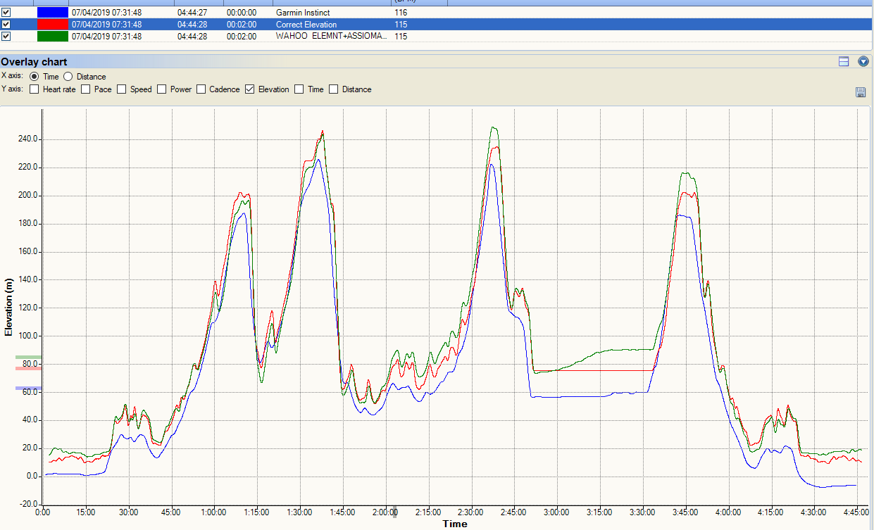 The image below shows the ‘correct’ elevation profile vs that from the Instinct which had 3D-GPS (+GALILEO) enabled and autocalibration of the altimeter also enabled. Instinct auto-calibrates when it gets a GPS fix at the start of your activity. As you can see, the Instinct seems to track the actual elevation profile pretty well but the Instinct recorded ascent=508m (correct=727m, Wahoo=737m) vs descent=478m (correct=600m, Wahoo=702m) – which is not as good as it looks on the chart.