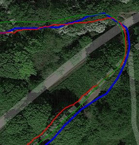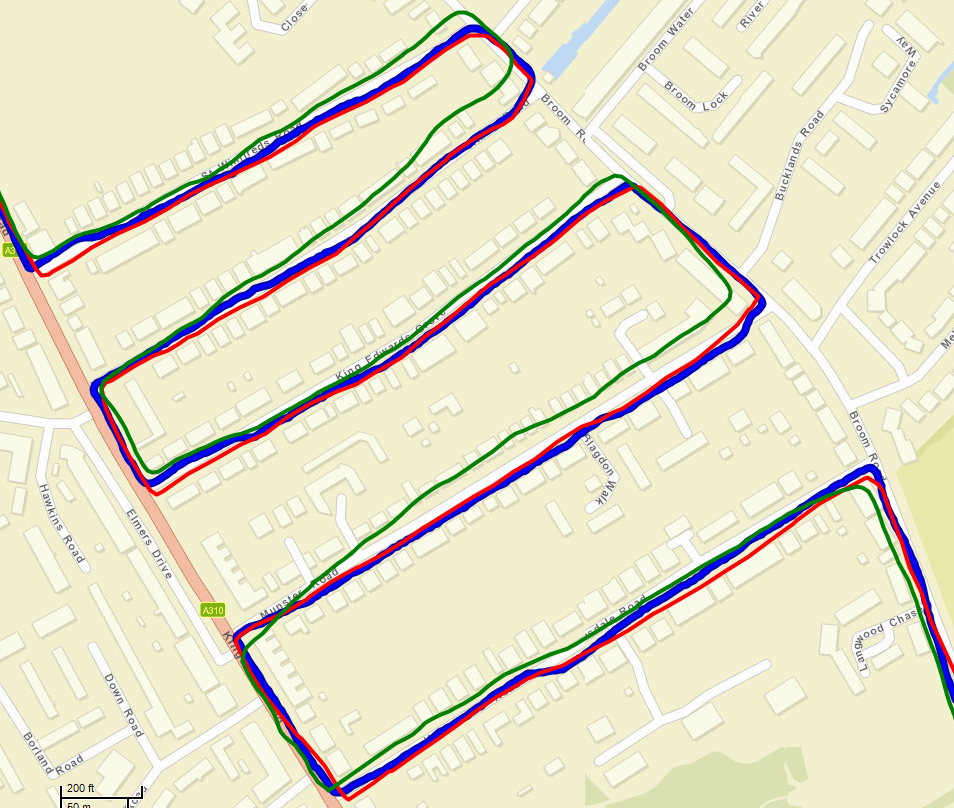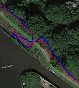 Looking in more detail you will find discrepancies between tracks as shown in the following image. But GPS is only accurate to about 5m so you would expect this level of performance as each device could be 5m inaccurate in a different direction. However, I’ve used GPS+GALILEO on the INSTINCT so you might expect better results. But the further realities are that GPS/GLONASS/GALILEO are impacted by trees, buildings and several other factors.