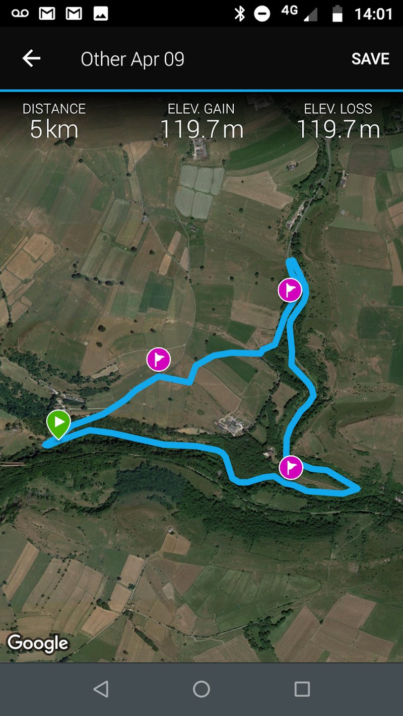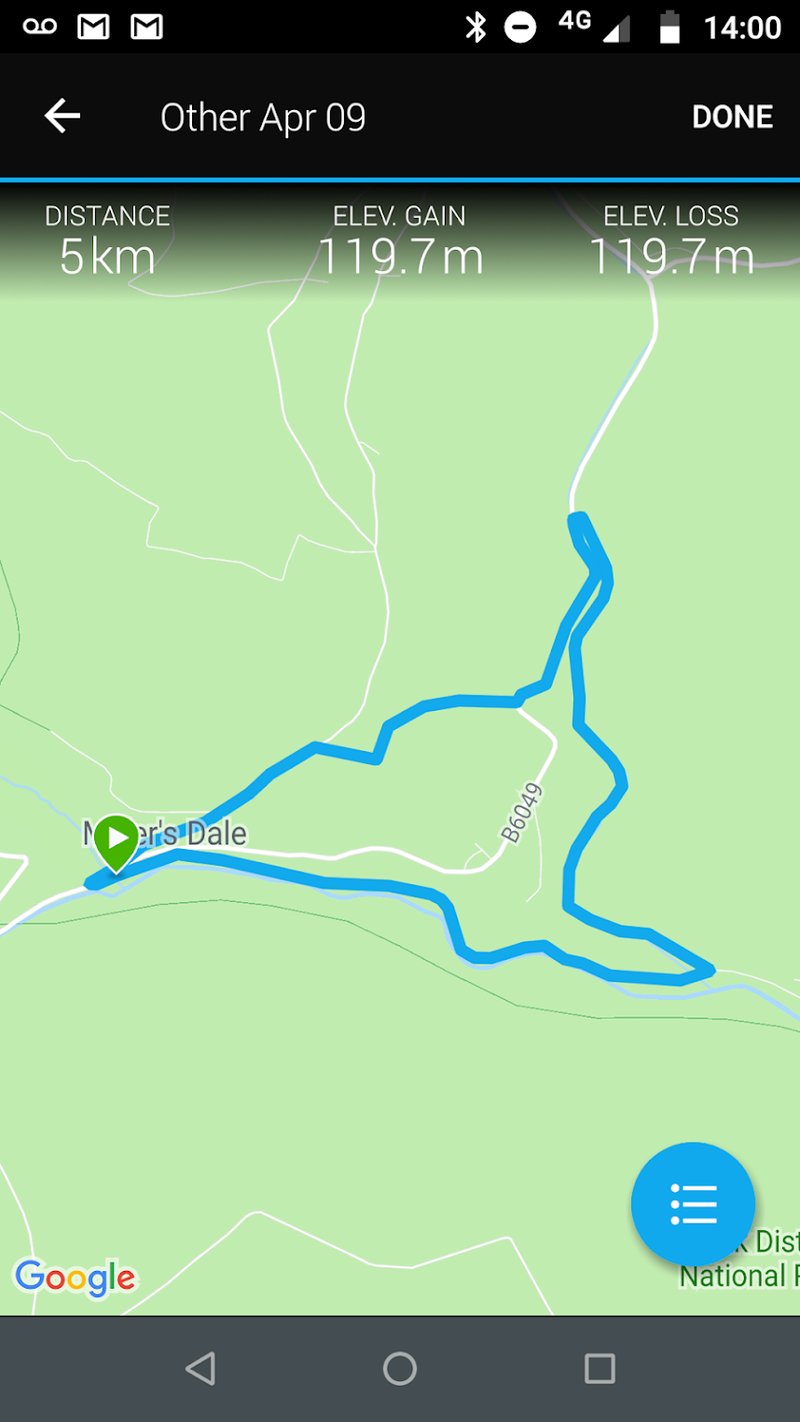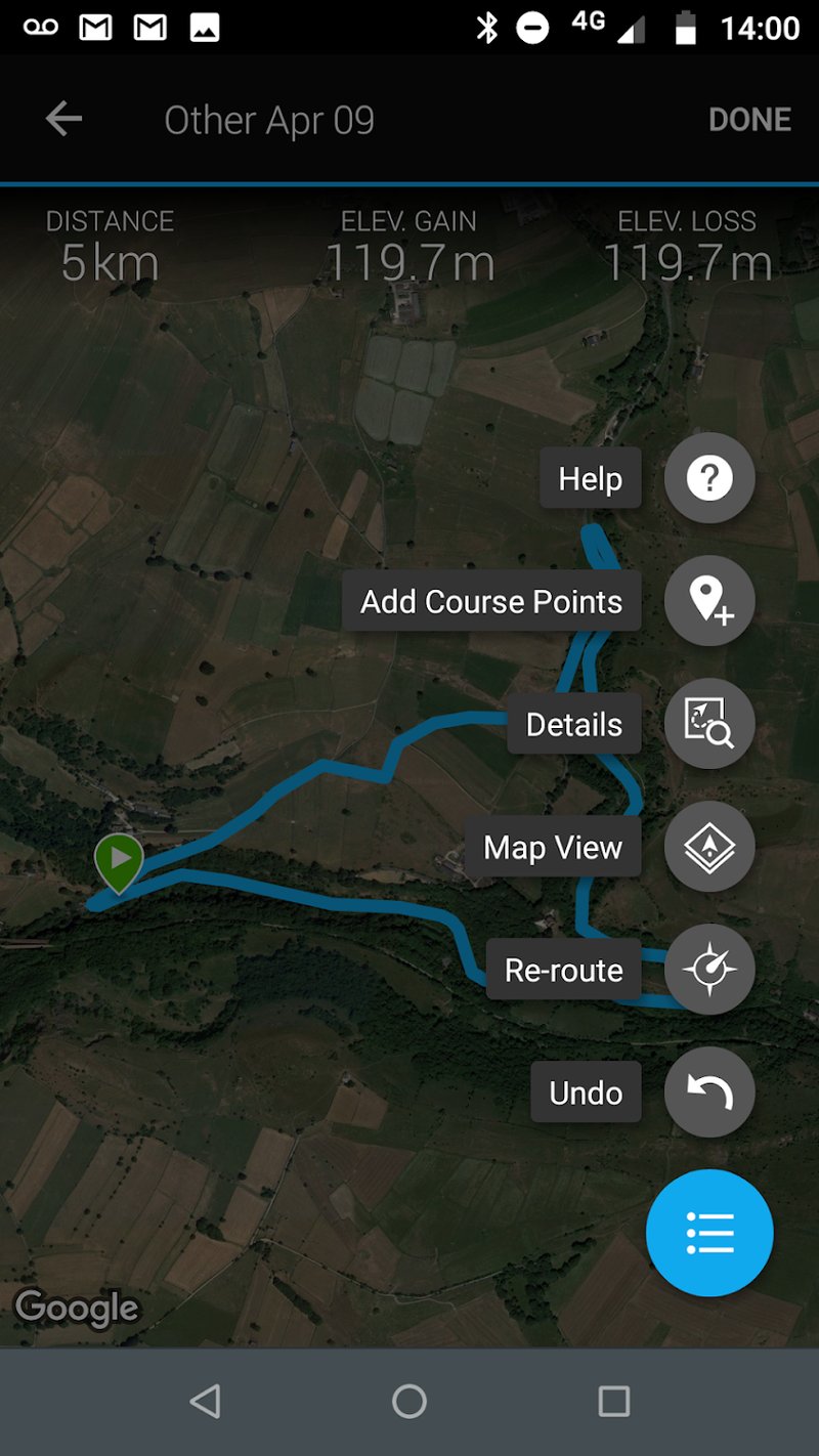 Using the Garmin Connect app you have several route creation options. Here is one where I chose the start point for a 5km round trip in the UK’s Peak District. I told Garmin Connect to start off to the North and it automatically created the round trip route of the required distance. I later added a few waypoints and double-checked the image by switching to satellite view – all was good. Creating, adding points and syncing this impromptu, round-trip route easily took less than 5 minutes.
