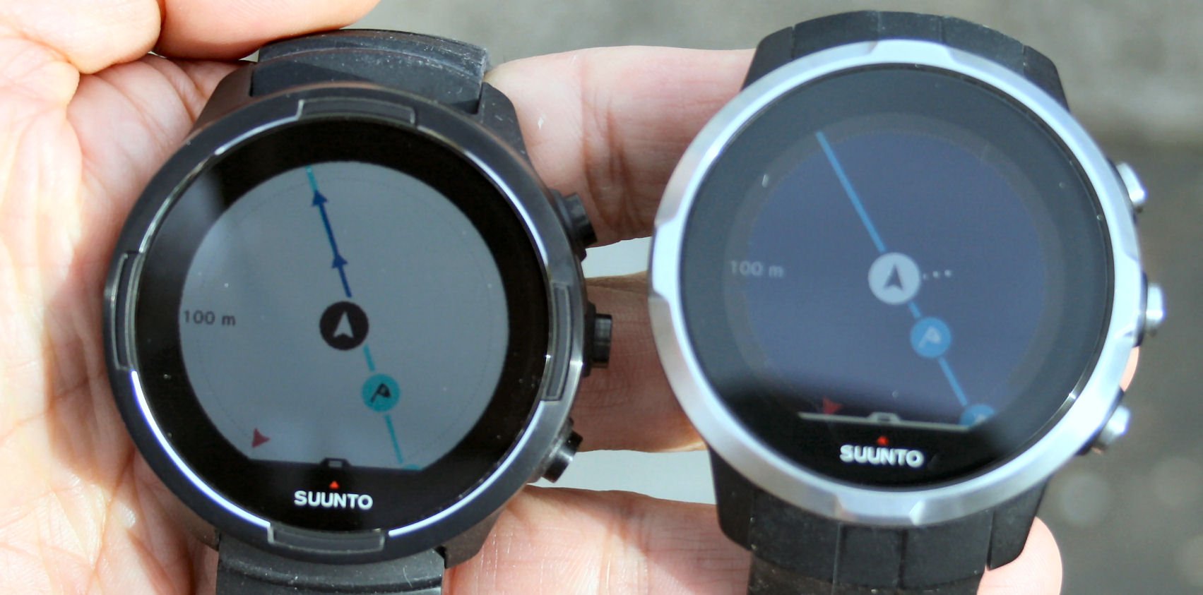 Here we can see the direction indicator on the Suunto9 to the left on the new firmware compared to the SPARTAN Sport on the right with the old firmware and following the same course. The course ahead is in dark blue and, on the left, has directional arrows on the course.
