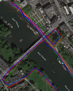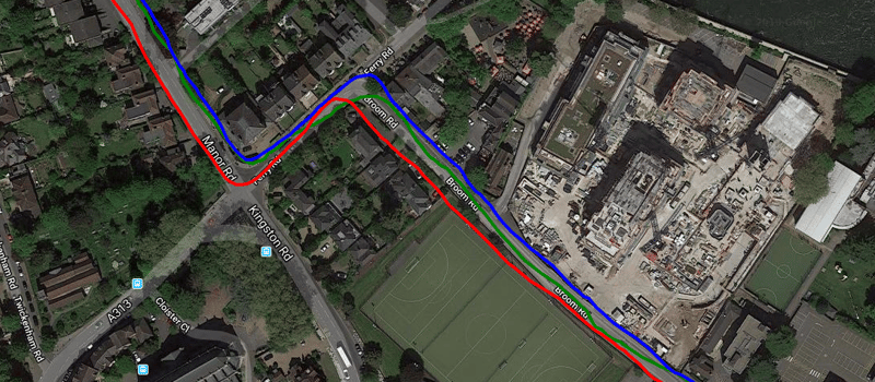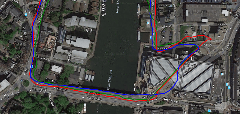 Here are 3 highlighted sections of the formal test (I base my overall view on normal usage too)…Garmin 945 (Red), Vantage Titan (Green), Ambit 3 RUN (Blue…on a different day)