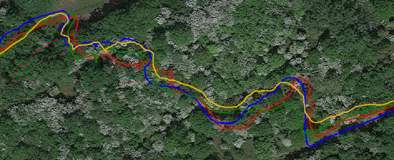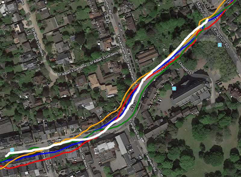 The lines on the following charts represent: Vantage M (Blue), Ignite (Red), Vantage V (Green), Vantage V Titan (Yellow), actual route (white, on the last image). I went around one of the blocks of the grid clockwise and the other anticlockwise to demonstrate any body-shielding effect.