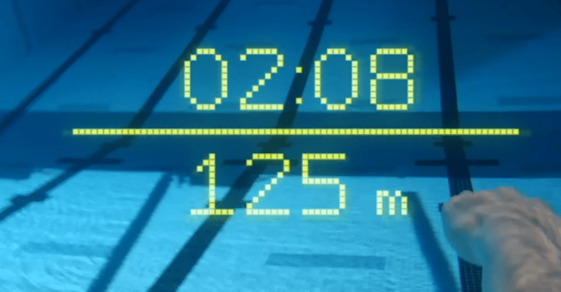 This swimming tech might be described as a Heads-up-Display (HUD) or some form of Augmented Reality (AR) linked to a motion sensor.