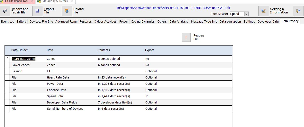 Let’s start off with looking at what data you are putting in a FIT file from a modern Garmin device. For this article, I’ve used fitfilerepairtool.info to interrogate some of my workout files from the recent Fenix 6 and other devices. Handily, fitfilerepairtool has just come up with a new PRIVACY mode to clean your FIT Files. More on that in a minute.