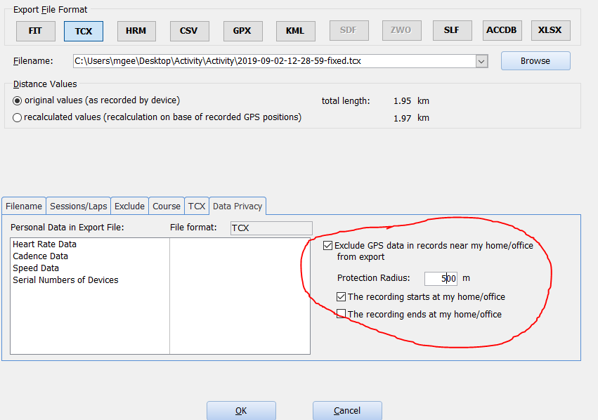 Of course, the GPS points of every single part of your ride is in the original source file be that TCX, GPX or FIT. Maybe that gives away the exact location of your home or office.