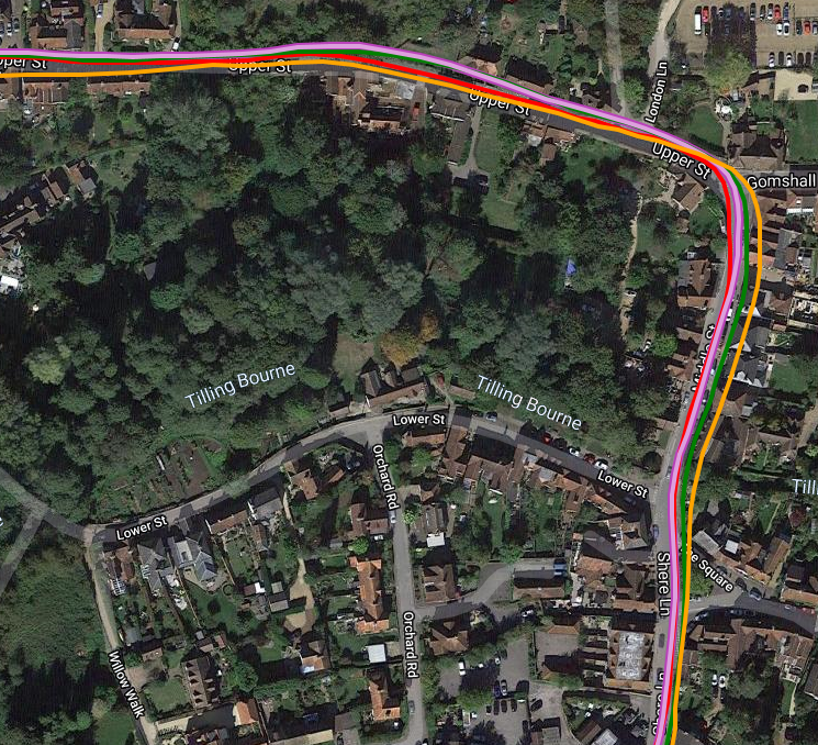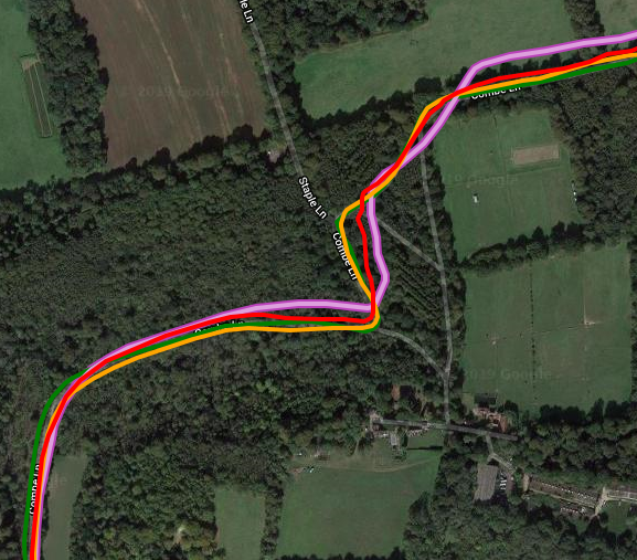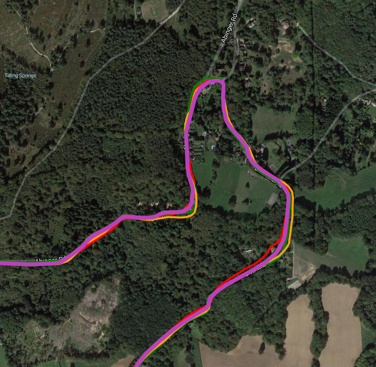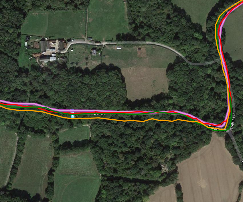 On a longer route in Surrey, there were some mildly interesting results. Here we have Wahoo Bolt (Pink), Polar Titan (Galileo, Yellow), Garmin 945 (Glonass, Green) and the Rox (Red). When there are quite a few devices you generally do NOT want to see the device in question (Rox, Red) at all. ie if it’s obscured by all the other tracks it’s probably doing alright. The Rox DOES perform generally ‘alright’ and you can see some deviations by it on the 3nd and 4th images where trees are involved. The Polar is probably just about the worst of all 4 (Galileo…strange that) but it’s a close thing as all the 4 devices mess up at some point or other.