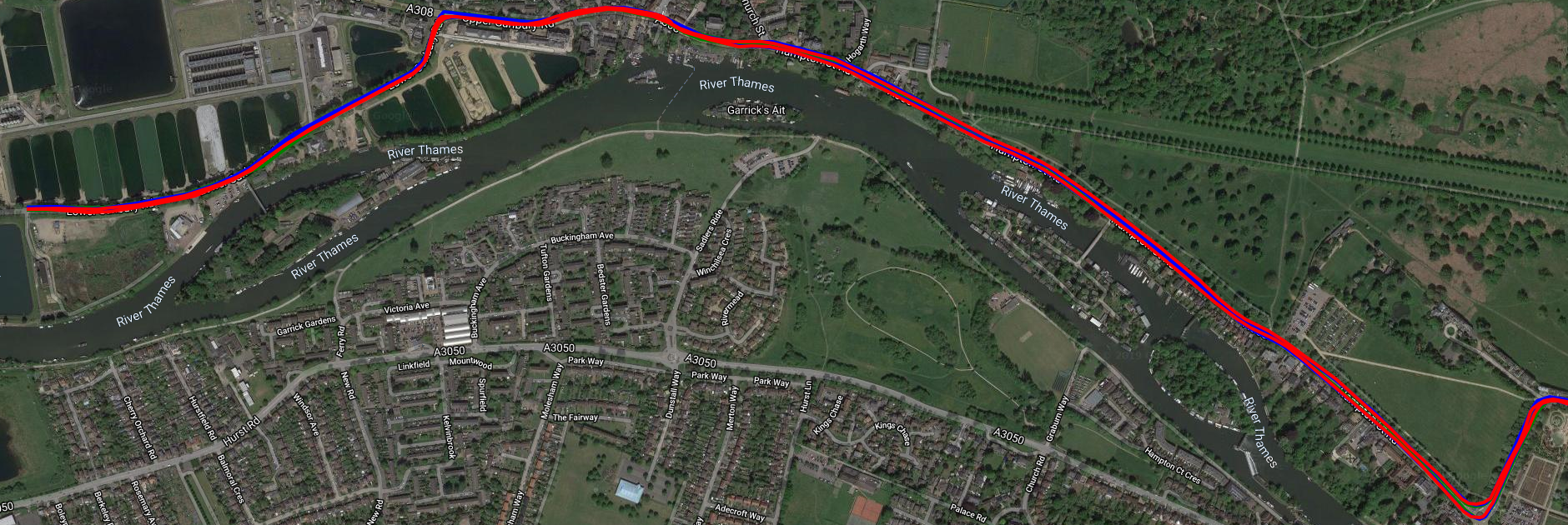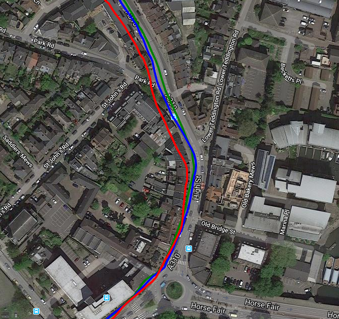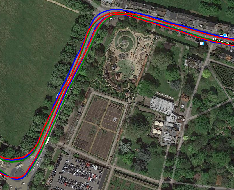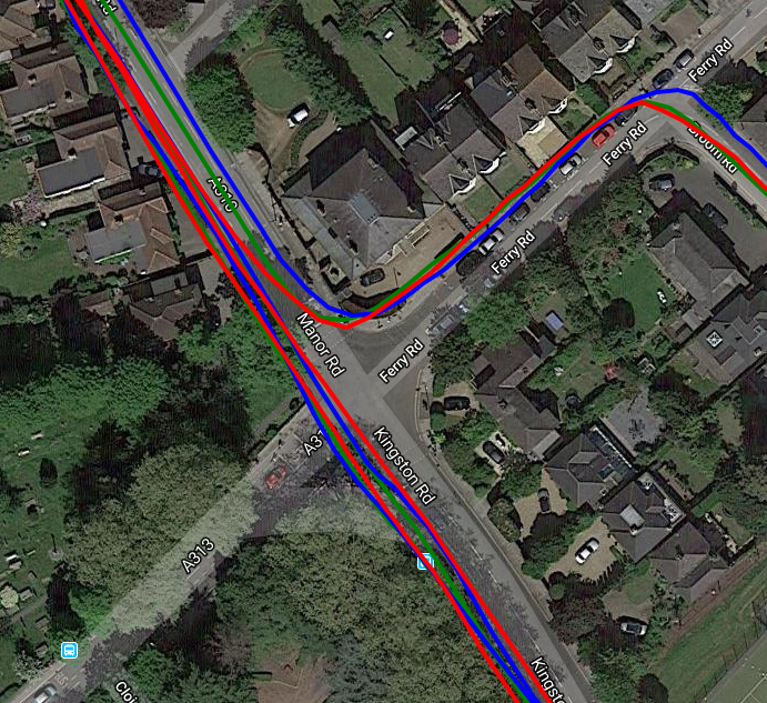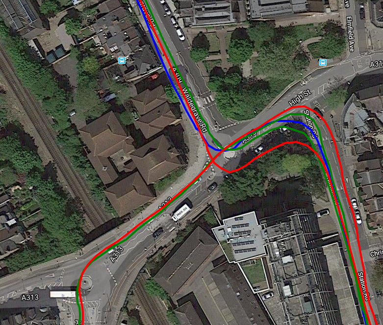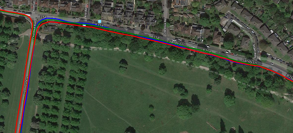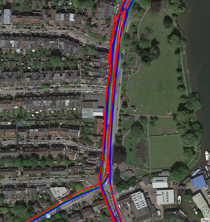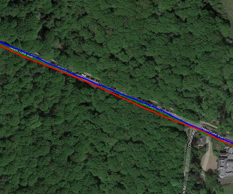 So I tried cycling close to walls and trees again, somewhere else, on a different day yet got acceptable results [Rox blue, Elemnt Red, iD.TRI Green]. The fourth image is surprisingly good as it is running East to West about 2m from a 3m high brick wall almost continuously for over 1km…Good results from all (only part of the wall section is shown).