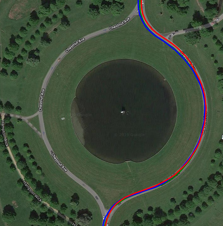 At the zoomed-out level, you can see the Rox (Blue), iD.TRI (Red) and ELEMNT (Green) are nearly identical, although the second image shows some deviation when zoomed in but not more than 4-5m from the Rox, so all is good.