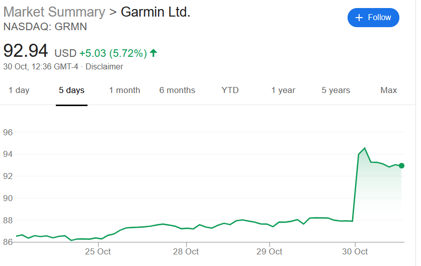 Garmin’s shares have jumped about 5% on news of a great last quarter performance.