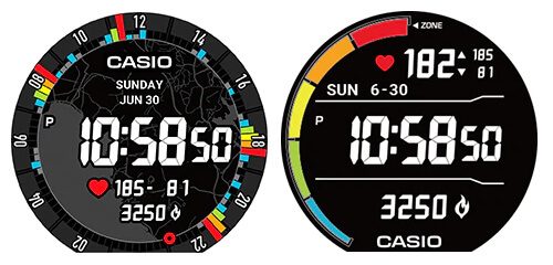 Also pre-loaded is Casio Sports/Activity app which makes use of the now-ubiquitous OPTICAL HEART RATE SENSOR and Casio makes good use of that with new screens for sports that include instant heart rate, heart rate zones and heart rate trend information. I quite like the screens and, especially, the innovative 24×7 heart rate intensity ‘dial’ (first image), however others amongst you might bemoan the sometimes-cluttered screens.