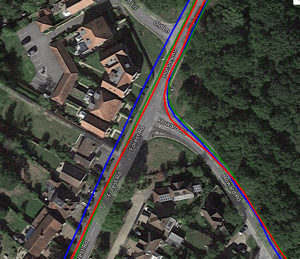 I can show LOTS of good examples for the F21’s GPS, indeed negative findings were HARD to come by when cycling. Here are two less good parts of a ride, once where the F21’s track (blue) runs parallel the road (but I wouldn’t be concerned about that) and then there is the second image where the F21 (blue) loses a GPS signal for a couple of minutes before finding it again and returning to the correct route.