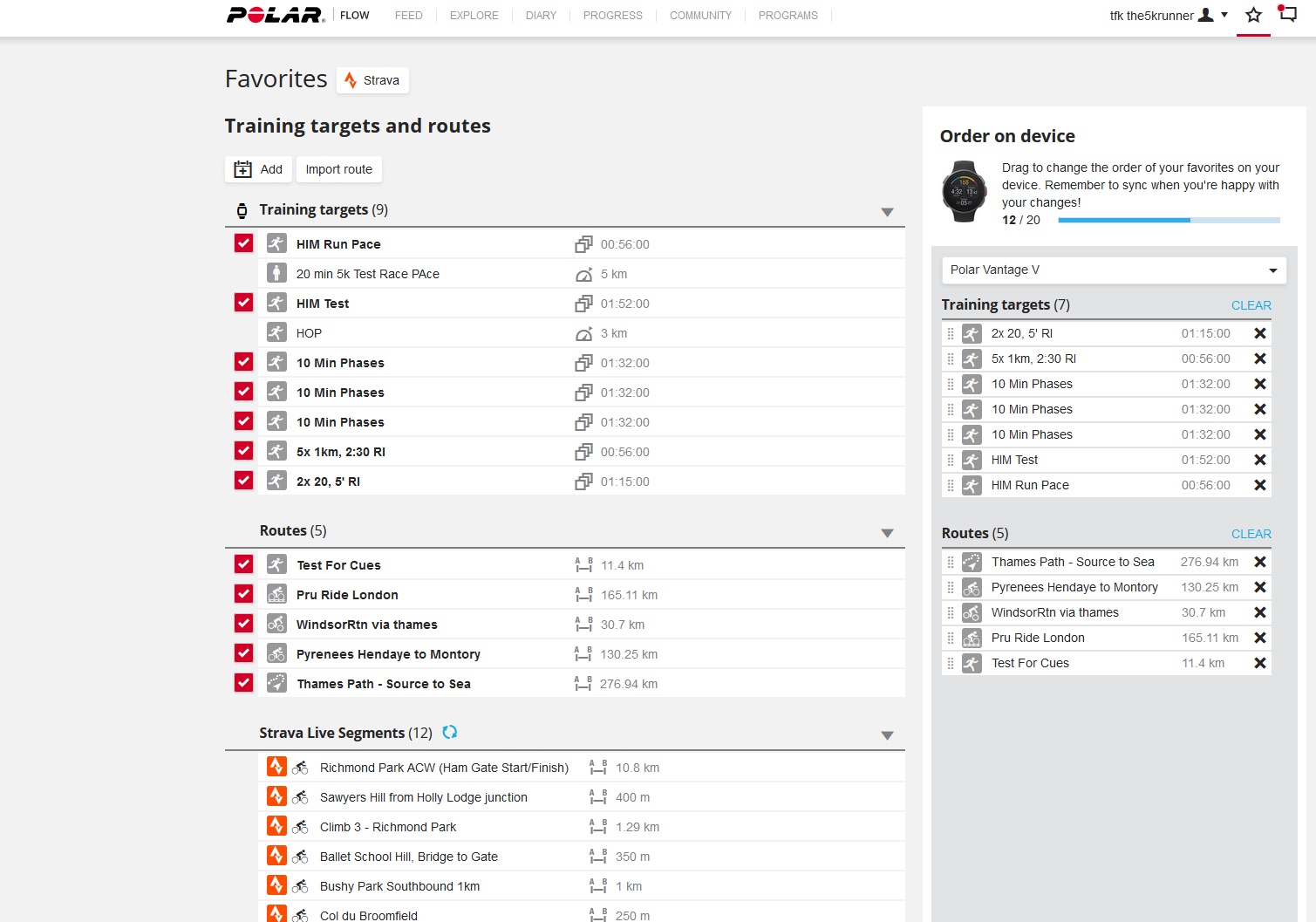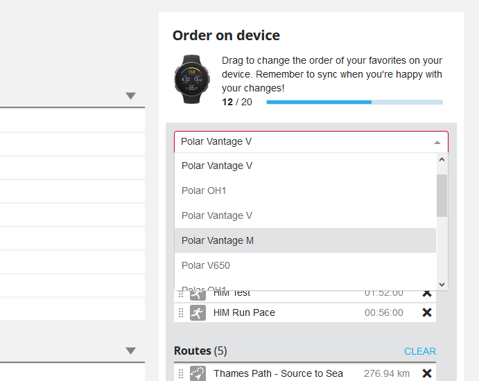 OK, it still looks a bit old fashioned but I think it’s now much clearer which favorites are on your device. Note that your device can be selected on the right hand side if you have more than one and STRAVA will appear very soon for the Vantage…like before Christmas ’19. You can even drag the order of your favorites around.