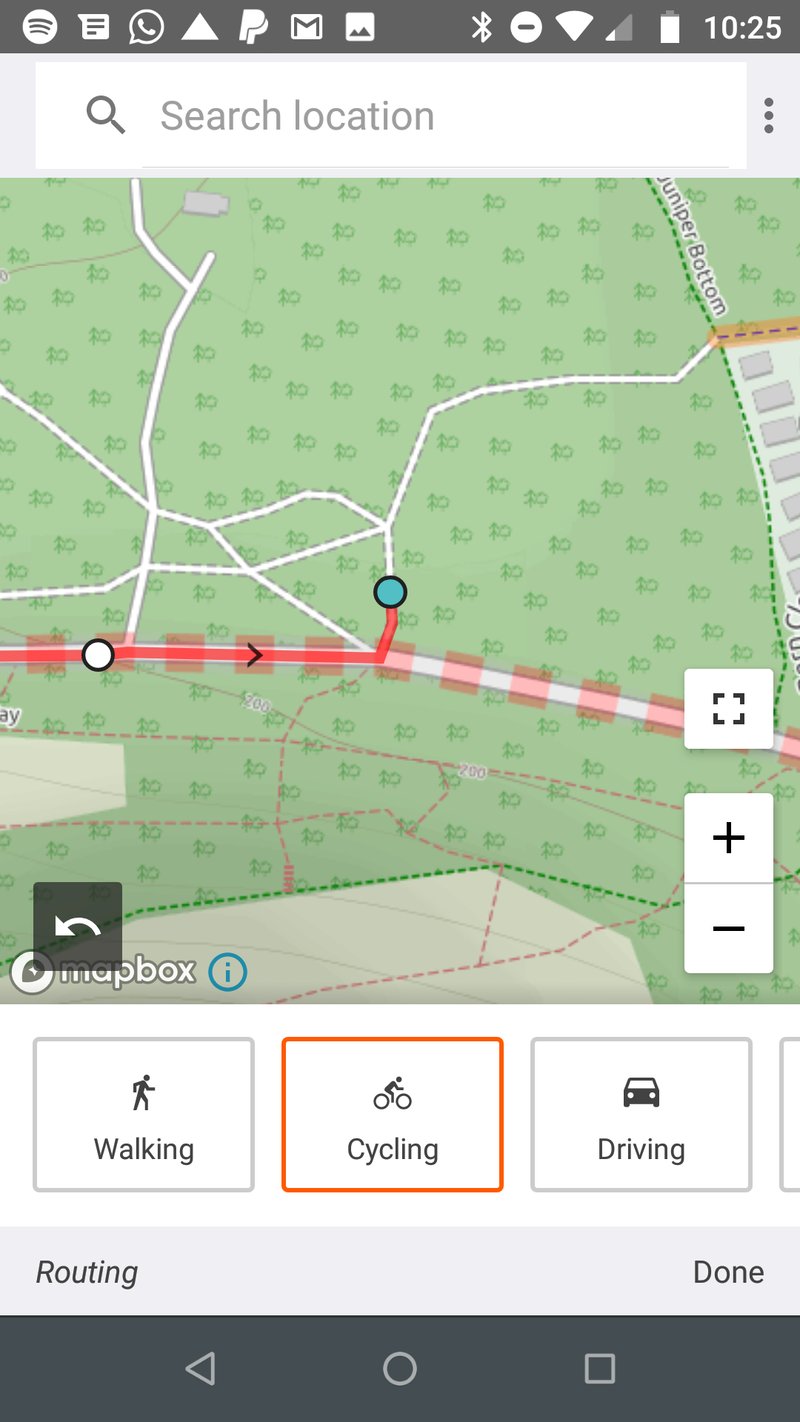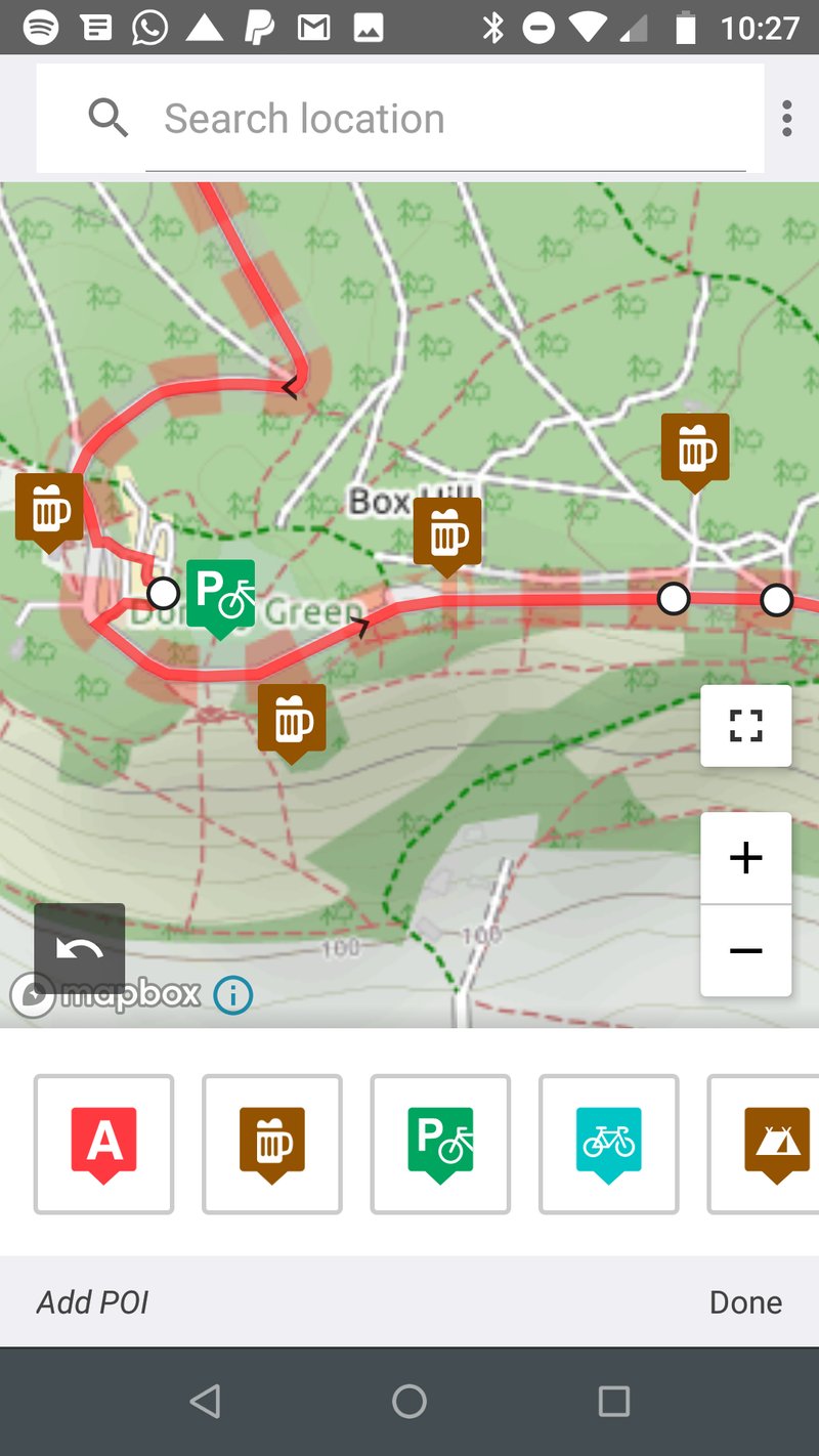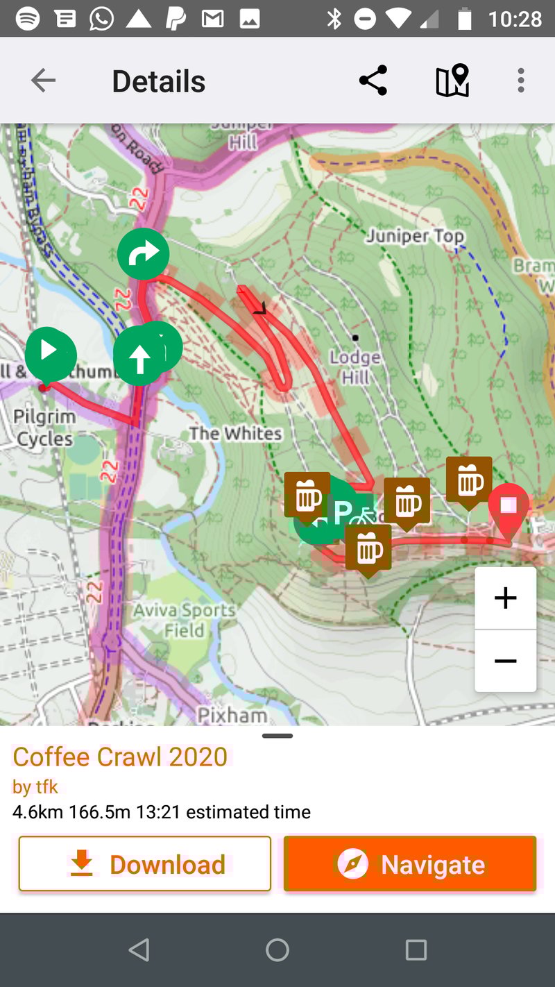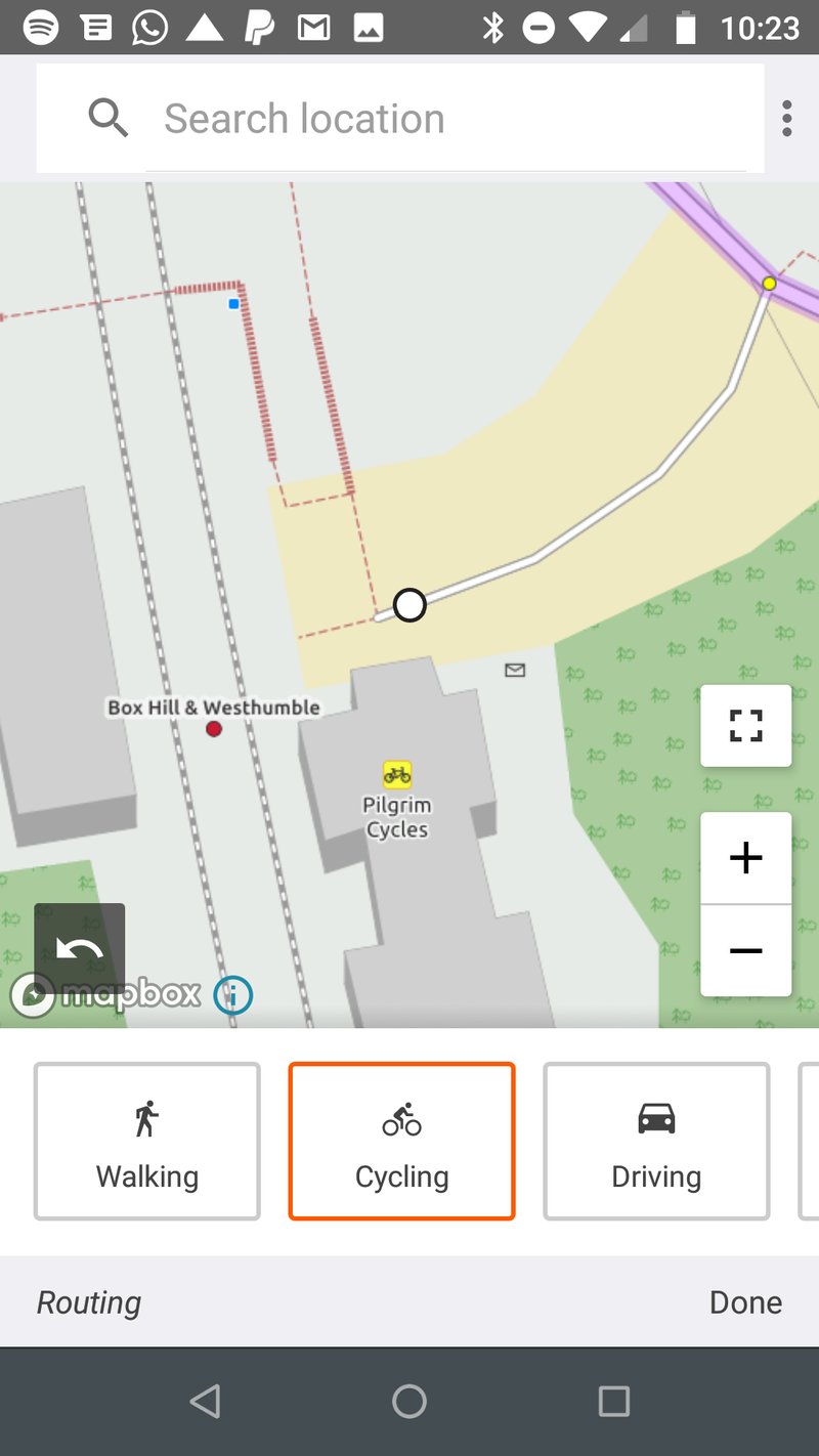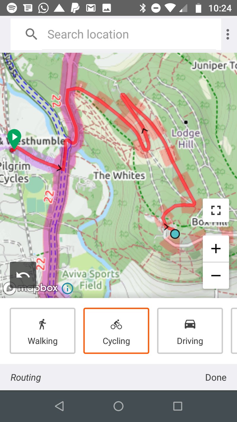 Here is my first attempt at creating a route on the mobile app. It starts from Pilgrim Cycles at Westhumble train station, mainly because they have very nice cake there (the coffee is not quite so good). The route then goes up the smooth-but-not-so-steep Box Hill where you can do your best to get a top-10,000 STRAVA segment place up what is a very popular hill in Surrey, UK.