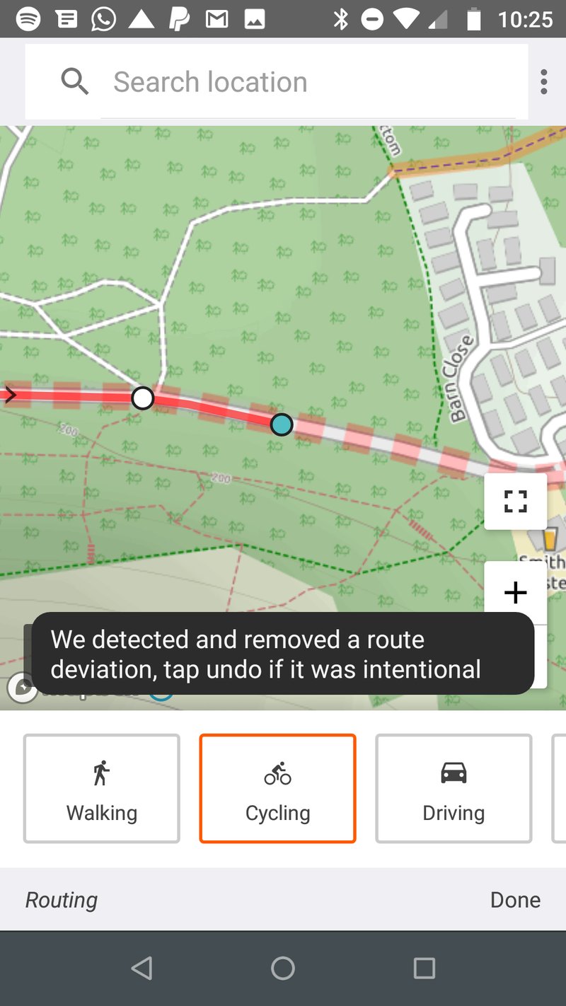 In this example, you can see I accidentally chose a side street (#ItWasDeliberate). However, when I select the next point along the route, the ‘spur’ into the side street is automatically removed. I’ve definitely done that before and usually, it’s relatively obvious when following the route what I needed to do to avoid the error in the route…but not always