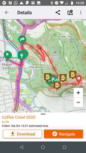 Turning back to the 7 previous slides, I’ll point out one last thing about them. You can see I’ve created a series of imaginary coffee stops (POIs) both ON and OFF the route. The off-the-route POIs are stored in RwGPS’s route file and there are bikenavs, like the Hammerhead Karoo, which can then optionally route to and from the POI mid-route.