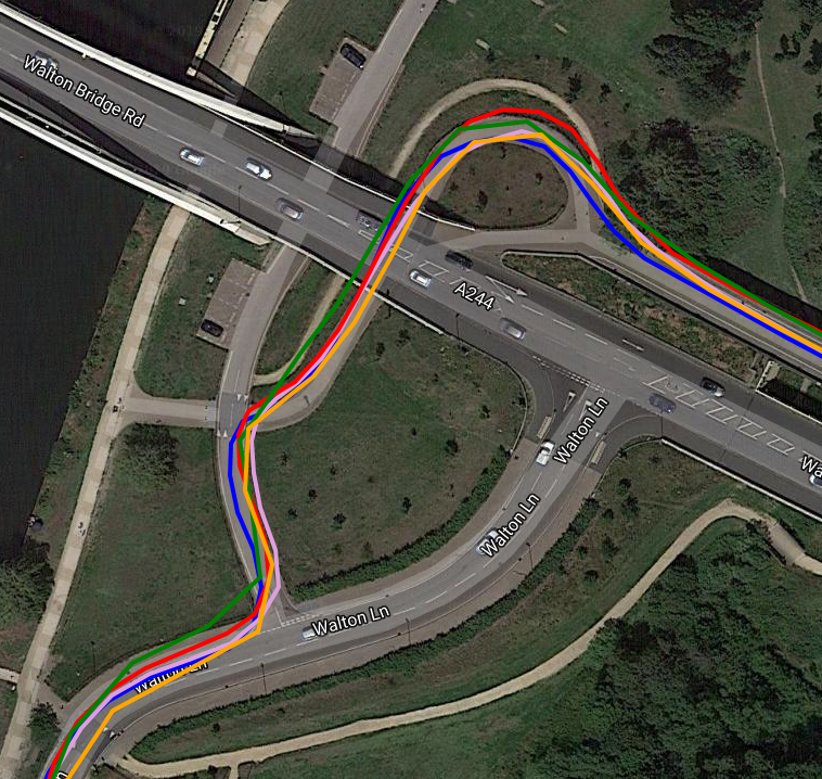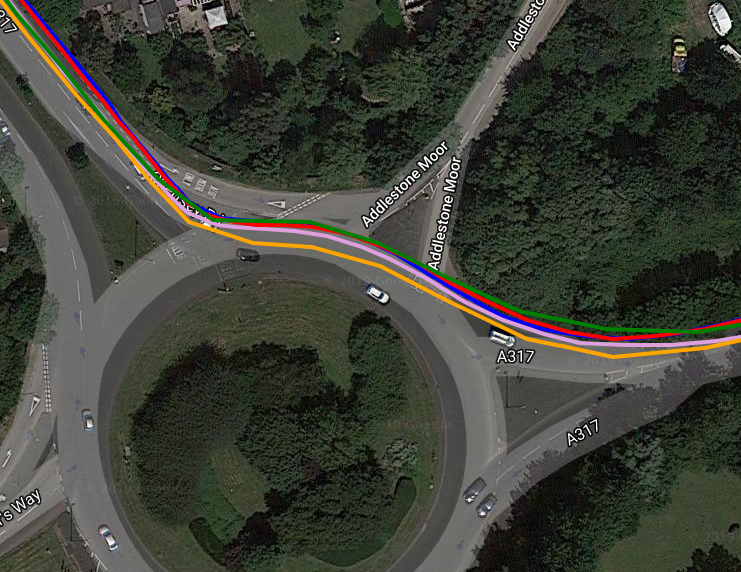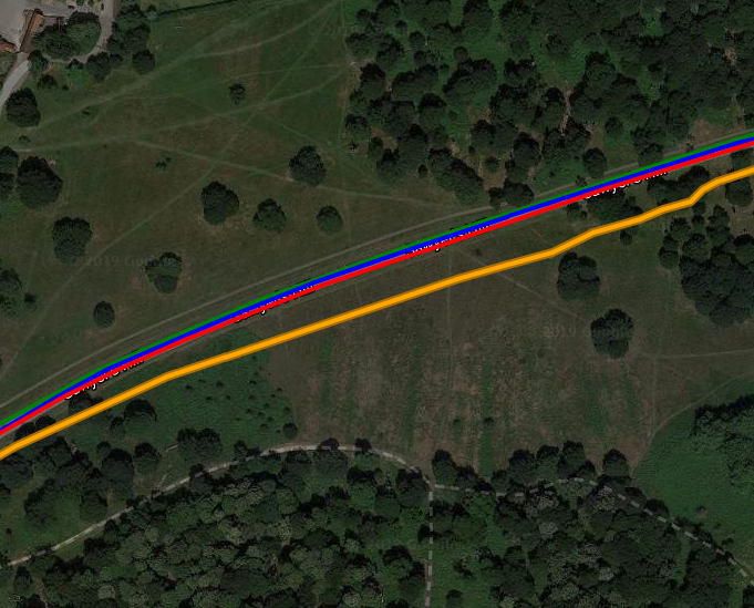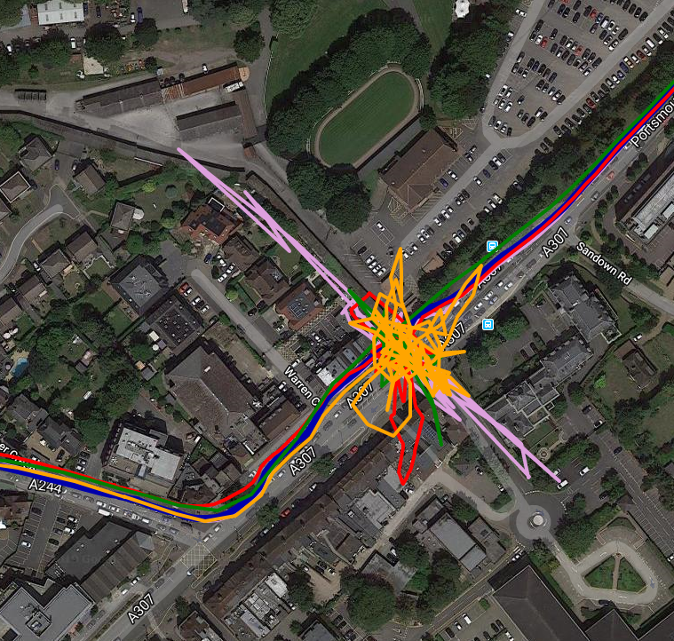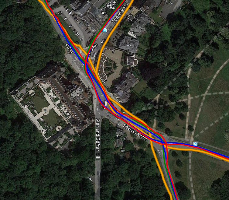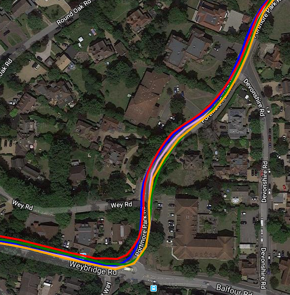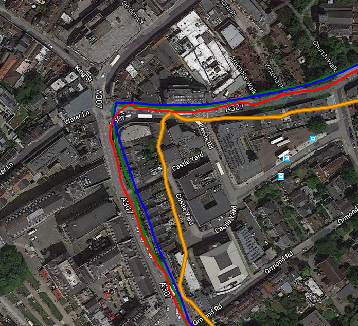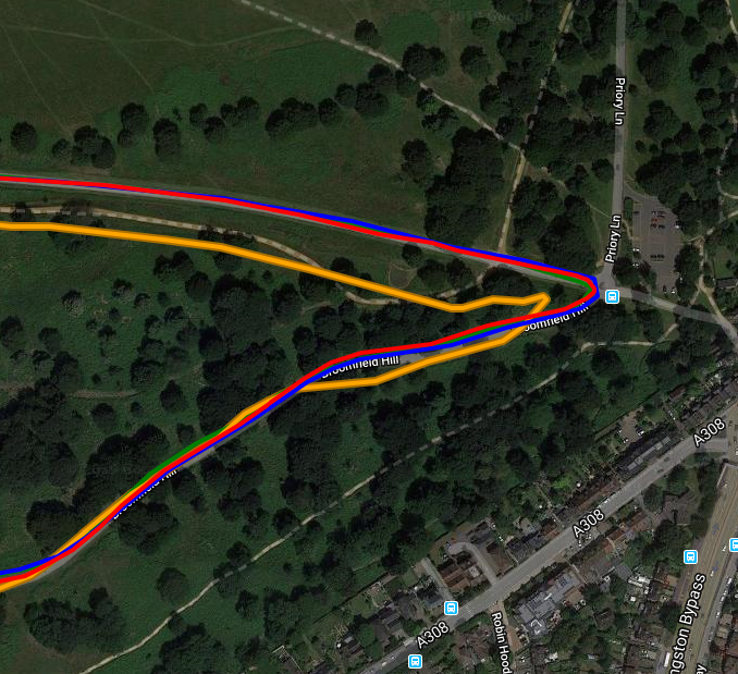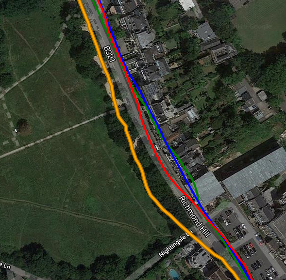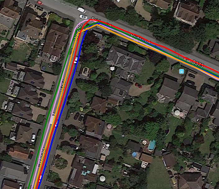 This is a GPS-only performance and, at times, I was closer to buildings than in the previous images which seemed to cause the Bryton some issues (Orange).