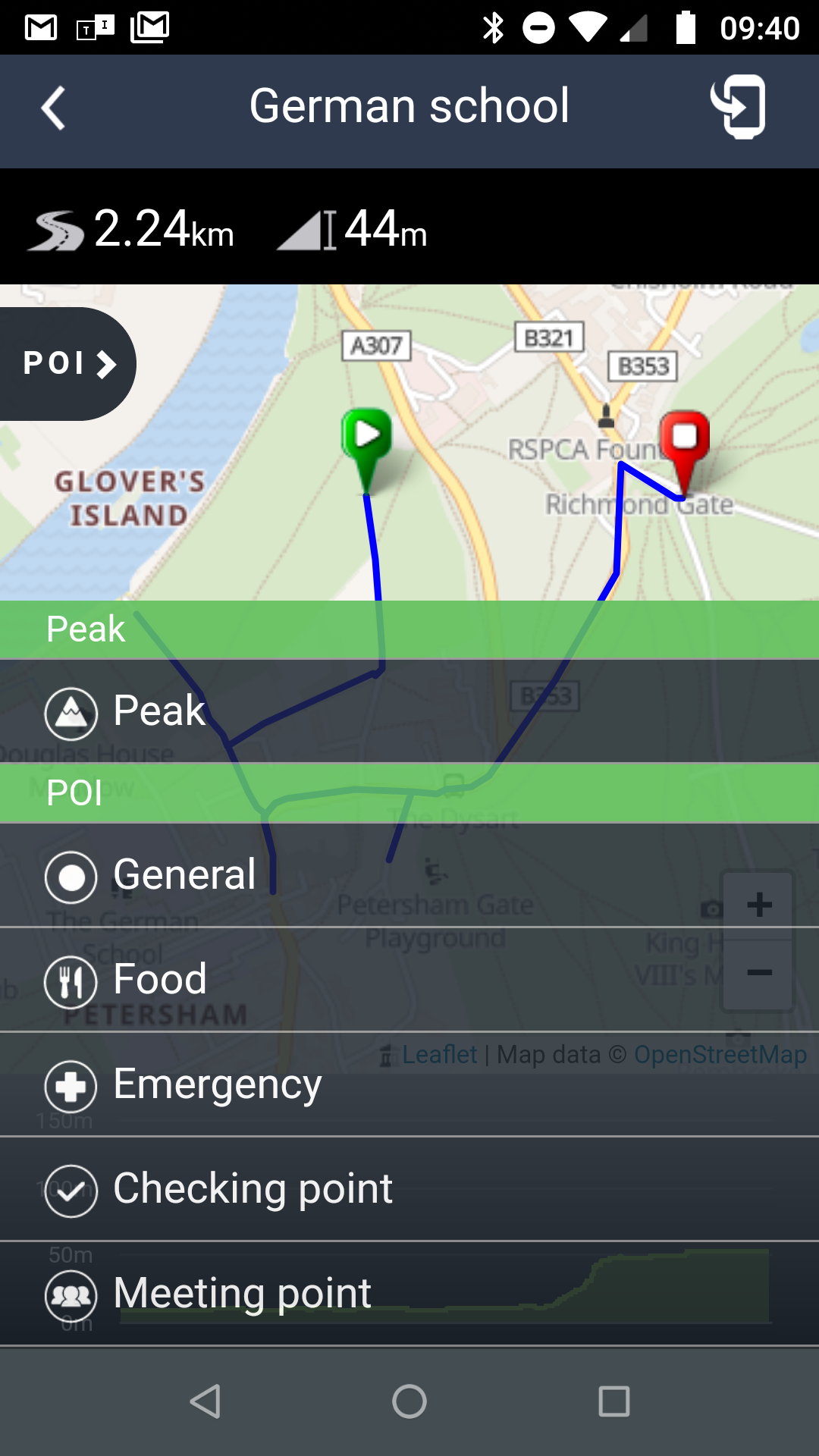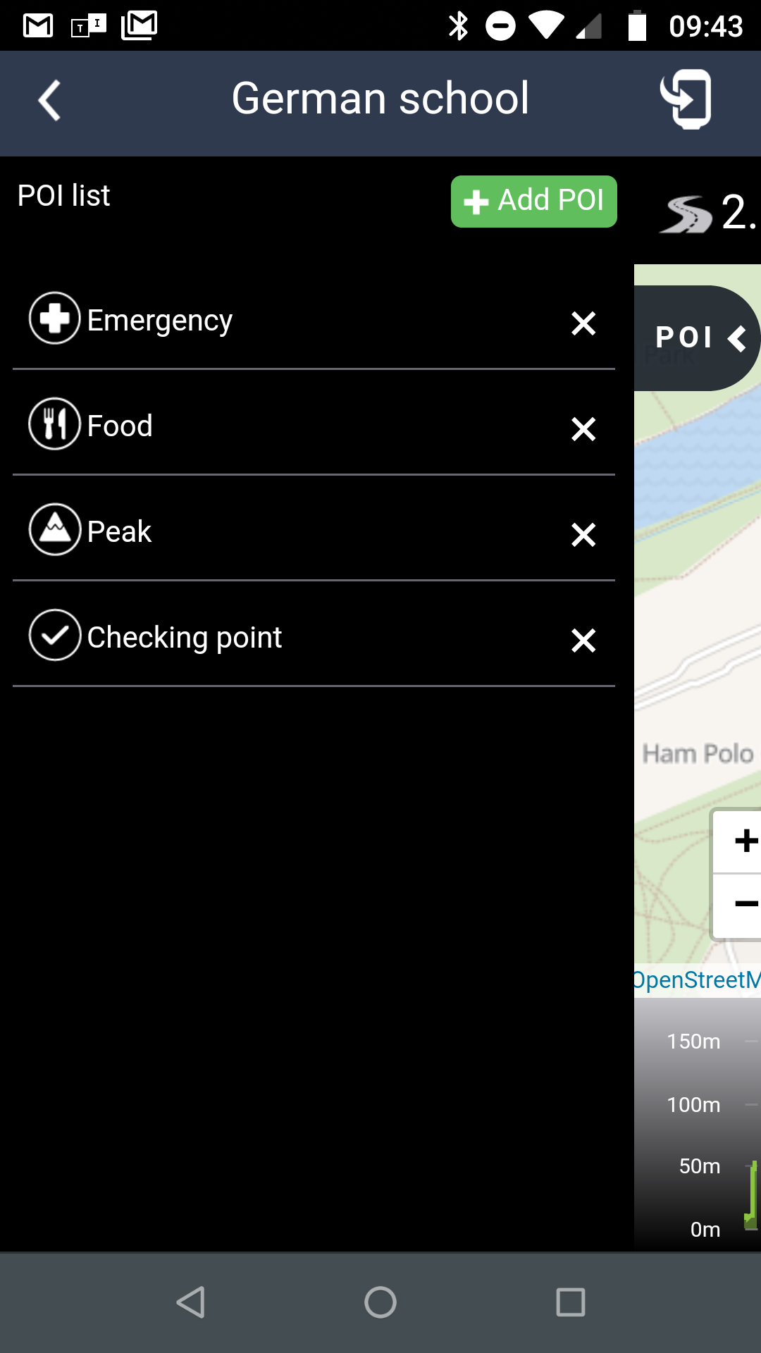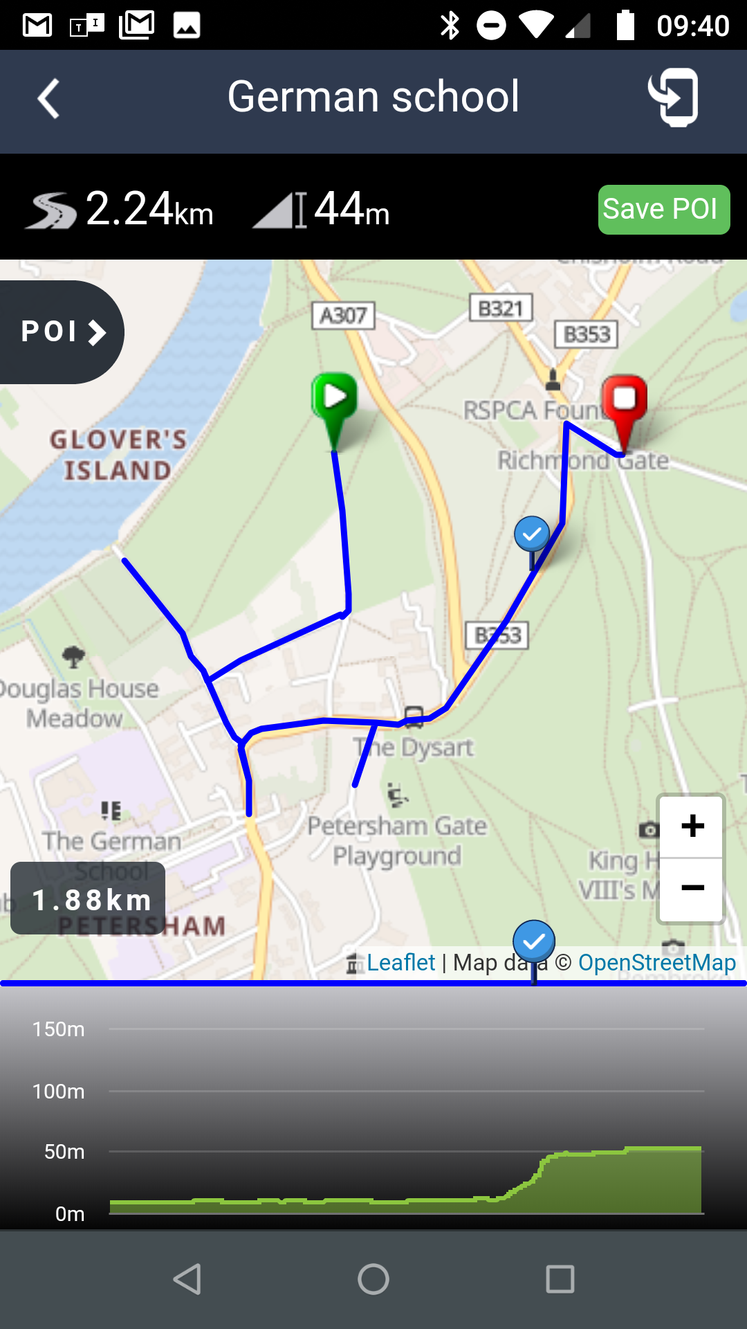 The following images also show how I have added some POIs to the route. These must all be done manually as there is no map layer which brings in the POIs…again that’s only fair for a low-priced navigation bike device. There is a little blue slider at the bottom of the map which drags a point along the route as you move it from left to right and when you are at the appropriate point you drop down the POI and give it a classification and name. It actually works quite well, although my recommendation would be to use a more powerful route creation tool like RwGPS and sync your route TO the Bryton. Clearly, if you are in the middle of nowhere then having the Bryton option as a fall back is very handy.