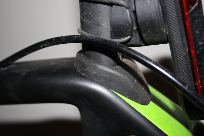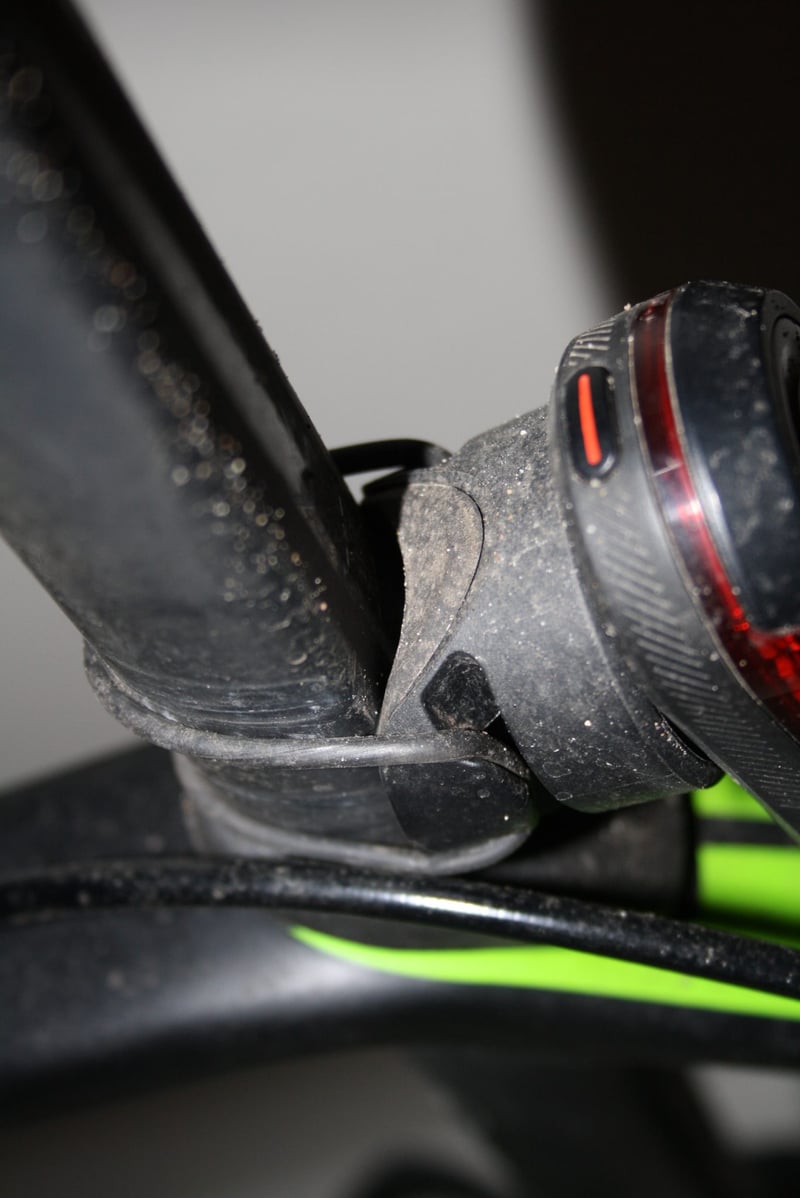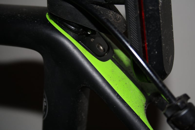 Seat post – This is a rather bizarre almost semi-circular shape in cross-section. The flat part faces rearwards and that’s pretty annoying as the standard bits of rubber that come with the Garmin Varia Radar are not designed for that, although they do just about work as shown below. The seat post comes with adjustment markings already etched onto it which are nice to have but not unusual. Yet, what is unusual is the bit where the seat post goes into the frame. There are two separate “bolts” here that keep the seat post in place, possibly if one fails there is a degree of redundancy? maybe not, but either way it’s all covered over with a nice rubber cover which keeps the road-gunk out. Also, if you take the seat post out then the uppermost bolt mechanism effectively marks the old position of the seat post so you can very easily re-fit it at exactly the same height. (Well, I thought it was a good idea).