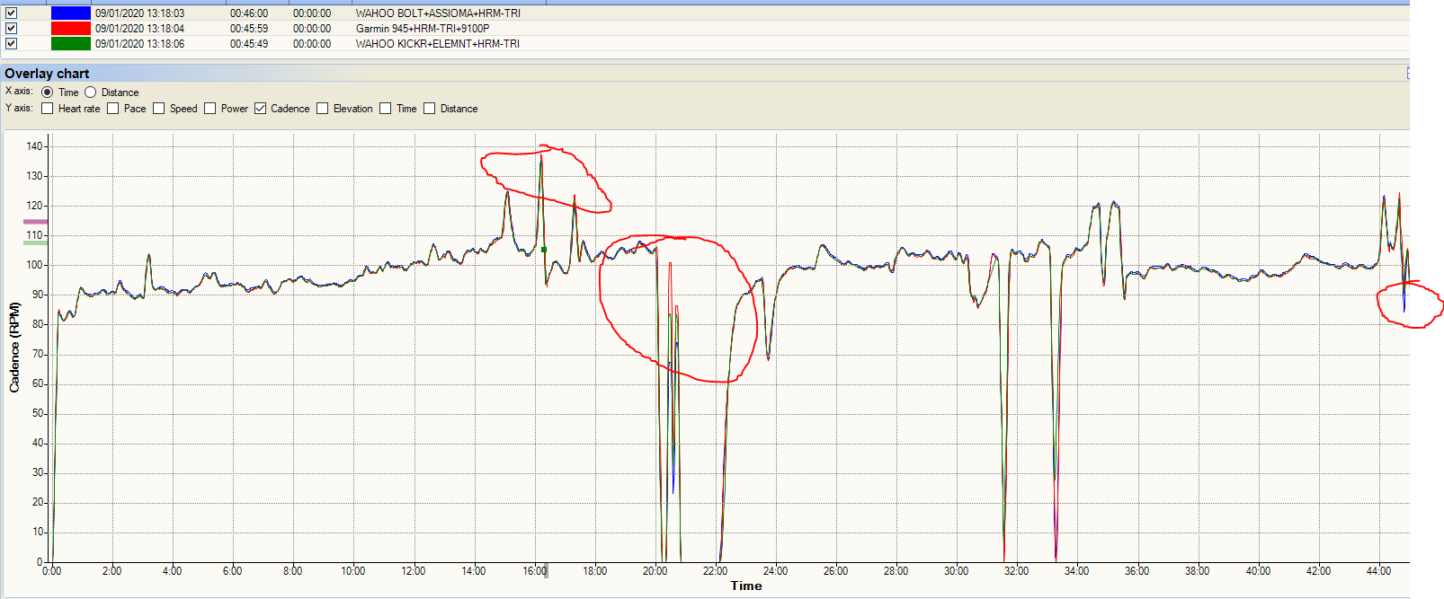 On another day in the smoothness of my pain cave, the average cadences are identical with all 3 at precisely 96.5rpm