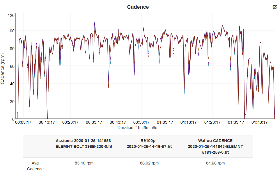 Here is another indoor ride and the average cadences were Wahoo Cadence (Kickr17) 92.6rpm, Assioma 92.9rpm, R9100P (92.4rpm or 92.5rpm if you remove the extra few seconds of recording at the end)