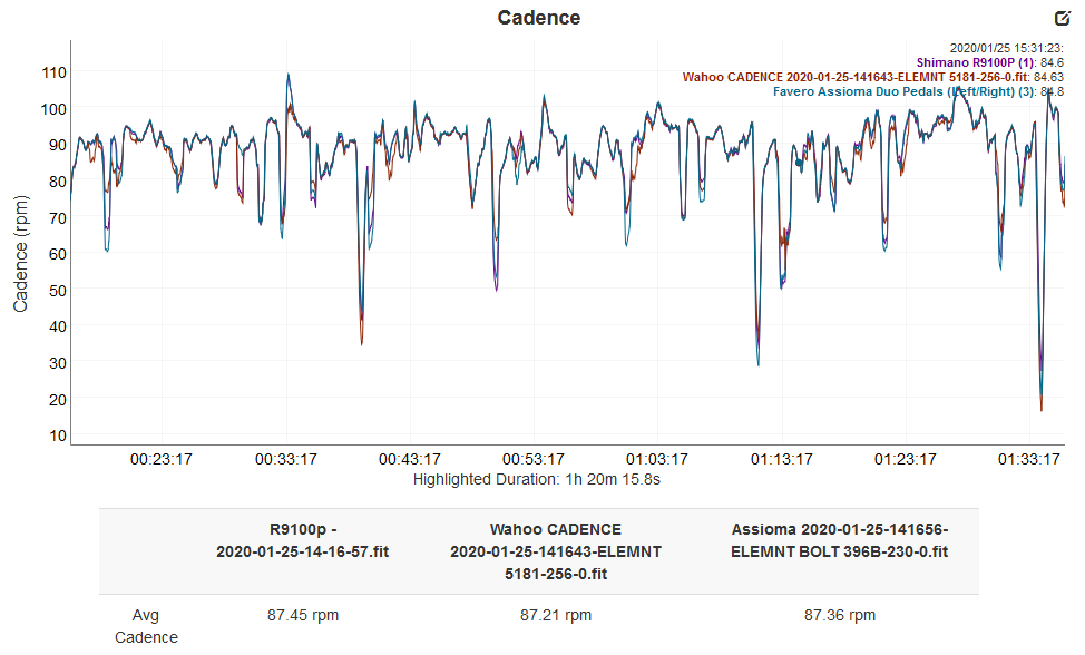 On this outdoor, bumpy Surrey outdoor group ride the cadence was +1rpm with the Shimano or -1rpm with the Assioma, depending on how you see it, which doesn’t sound like much but it’s over 1%. Sorry about the noise on this chart