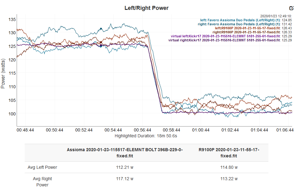 The results looked more reasonable with the Assioma and R9100P showing similar wattages but the Kickr showing MORE watts than both those two. #Sigh.
