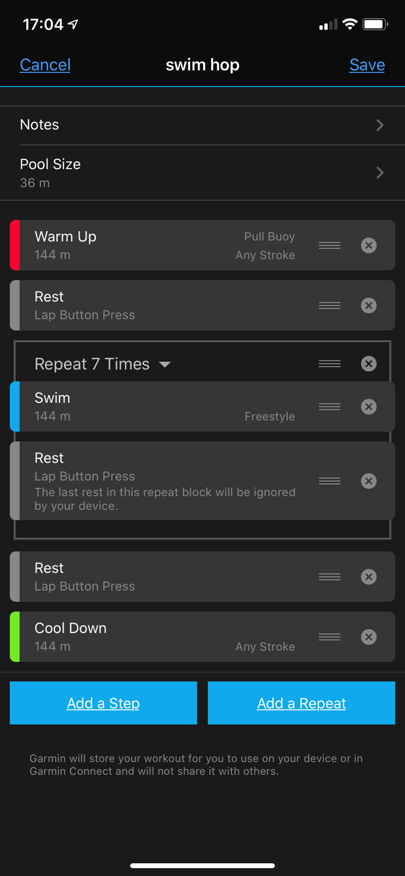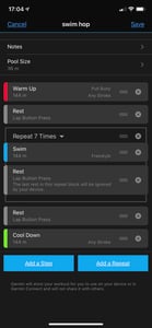 Garmin’s workout creator was ported to Connect Mobile some time ago and, at least to me, it’s always delivered a logical way to structure and create Run & Bike workouts. Applying the same principle to swim workouts seems wholly sensible.