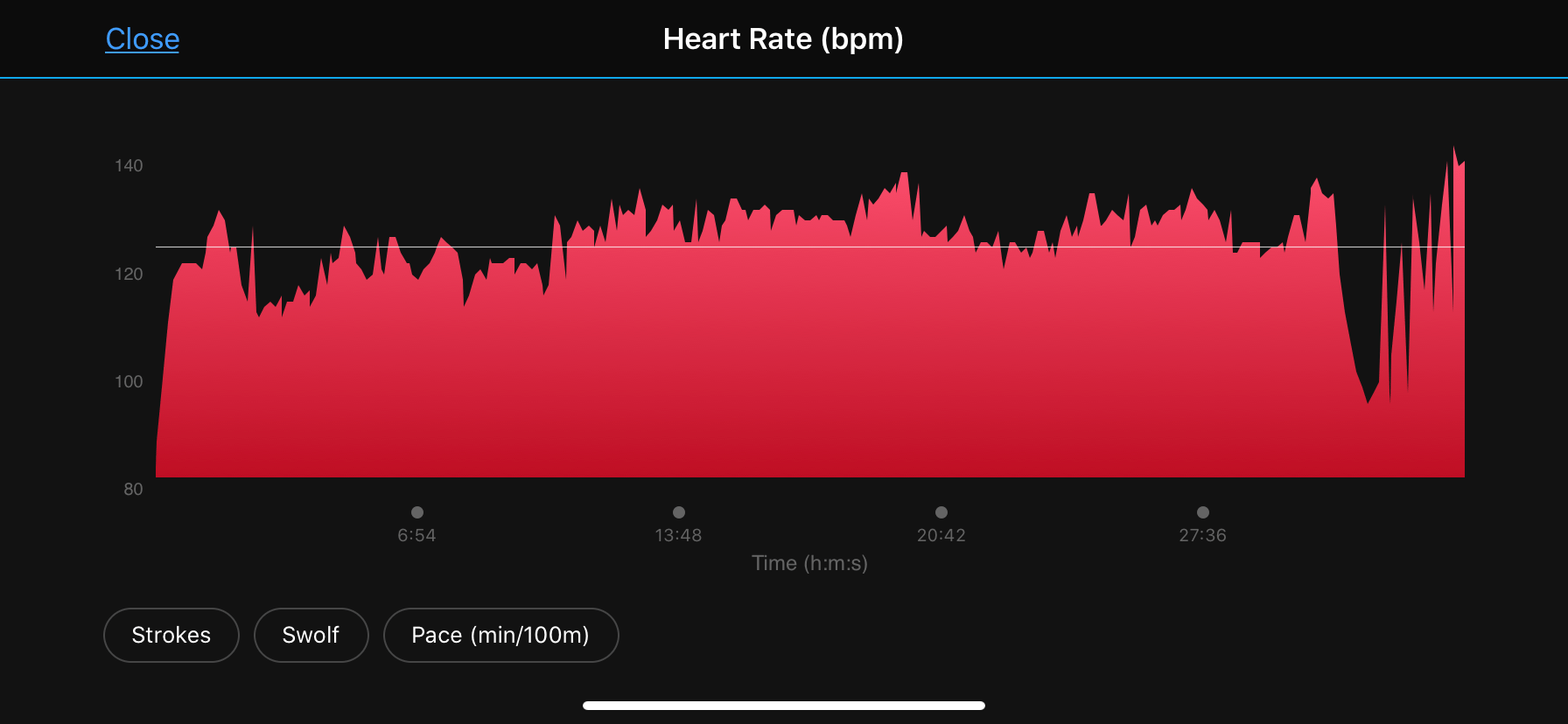 I use this all the time now, despite initially vowing never to let oHR near my wrists ever again. On the occasions that I checked the numbers, it certainly was NOT correct BUT the HR was accurate enough to get my time-in-zones vaguely accurately, and that’s all I personally need for my training load calculations. The HR graphs produced at the end do look sensible despite containing numerous inaccuracies, like this…