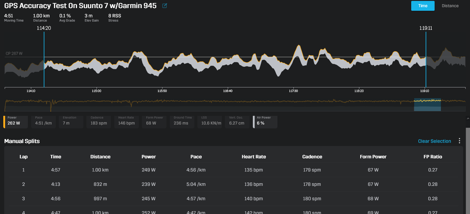 There is also an improved ability to analyse in more detail specific workout and it is now possible to better see individual laps that comprise the full workout. Here we’ve zoomed in on a particular KM on a long 10mile run and I’ve selected AIR power on the chart to also display the +/- effect of the wind