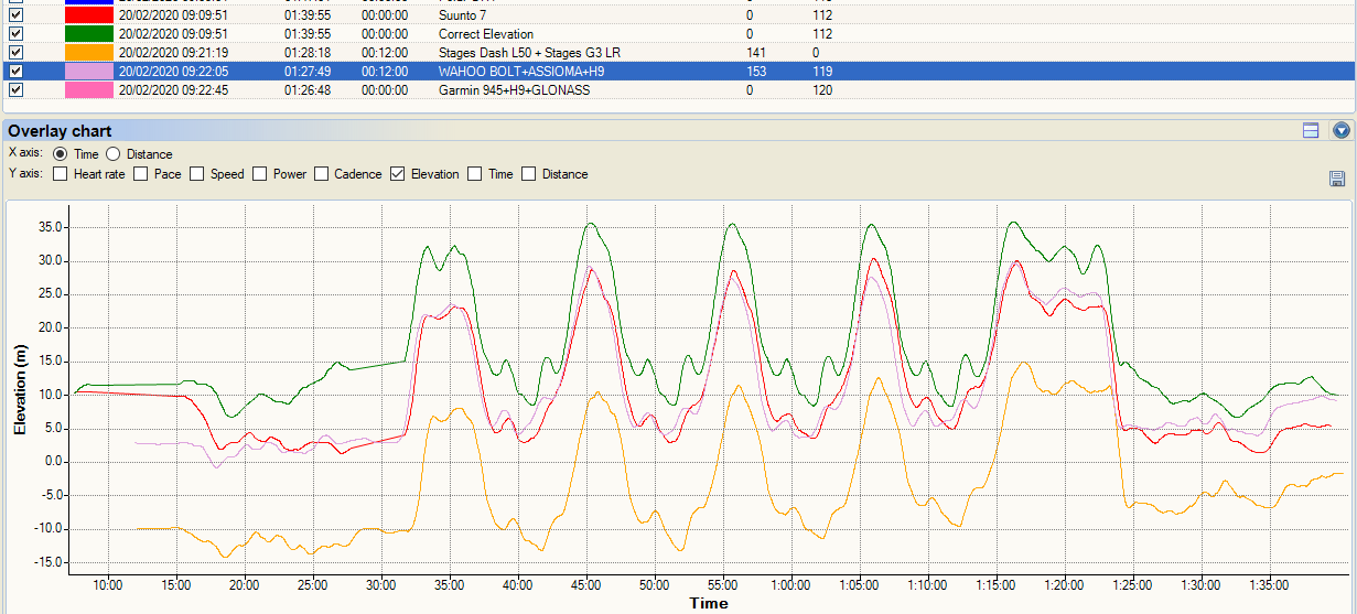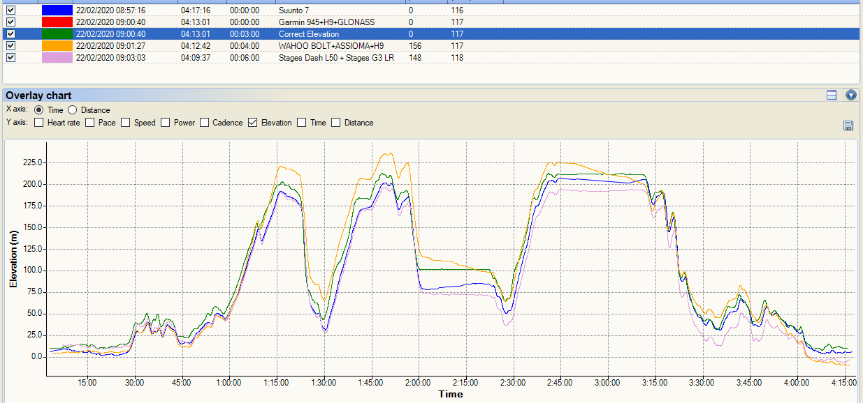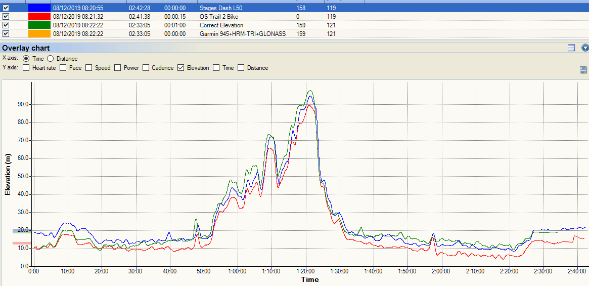 I didn’t calibrate the elevation on this one. On a shorter ride, you can see here that all the devices’ elevation profiles follow the correct elevation reasonably well, so your ascent/descent figures should be about right but clearly the absolute levels are somewhat ‘off’ in this example.