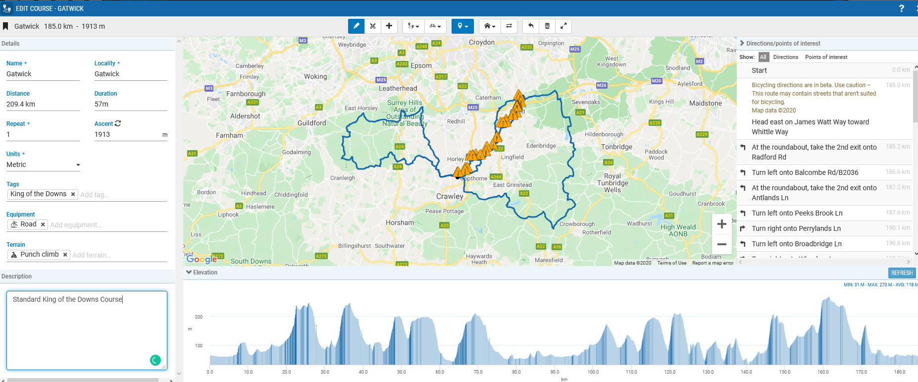 I managed to get my heatmap-driven routes sync’d in from STRAVA plus some from RideWithGPS and, apparently, AllTrails works as well. Providing that the imported route file came with TBT or elevation, then those ‘extras’ were incorporated correctly by Stages BUT there didn’t seem any way to add either elevation or TBT within the Stages environment. This seemed a strange but minor omission as when you create a new route in Stages Link yourself both TBT and elevation are added. The following image shows just that for a route I created myself in the stages environment. As you can see you get street names rather than a simple turn left/right instruction which is cool.