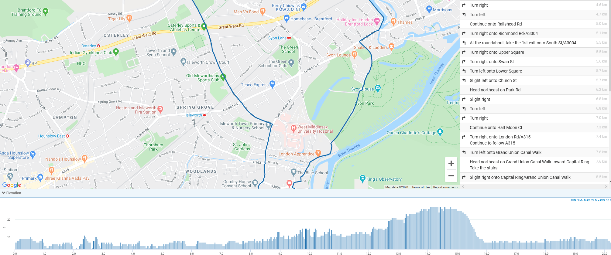 To me, another interesting aspect of following the route below is that it correctly routes through the green area in Syon Park…I had to change it to calculate a walking route to do that but, other than Garmin’s routes based on their Heatmap, NO OTHER bike navigation gets this particular segment right. OK I had to use walking mode but some competitors don’t offer a walking route option and, in any case, even when I did the same route in BIKE mode Stages still ALMOST got the route right.