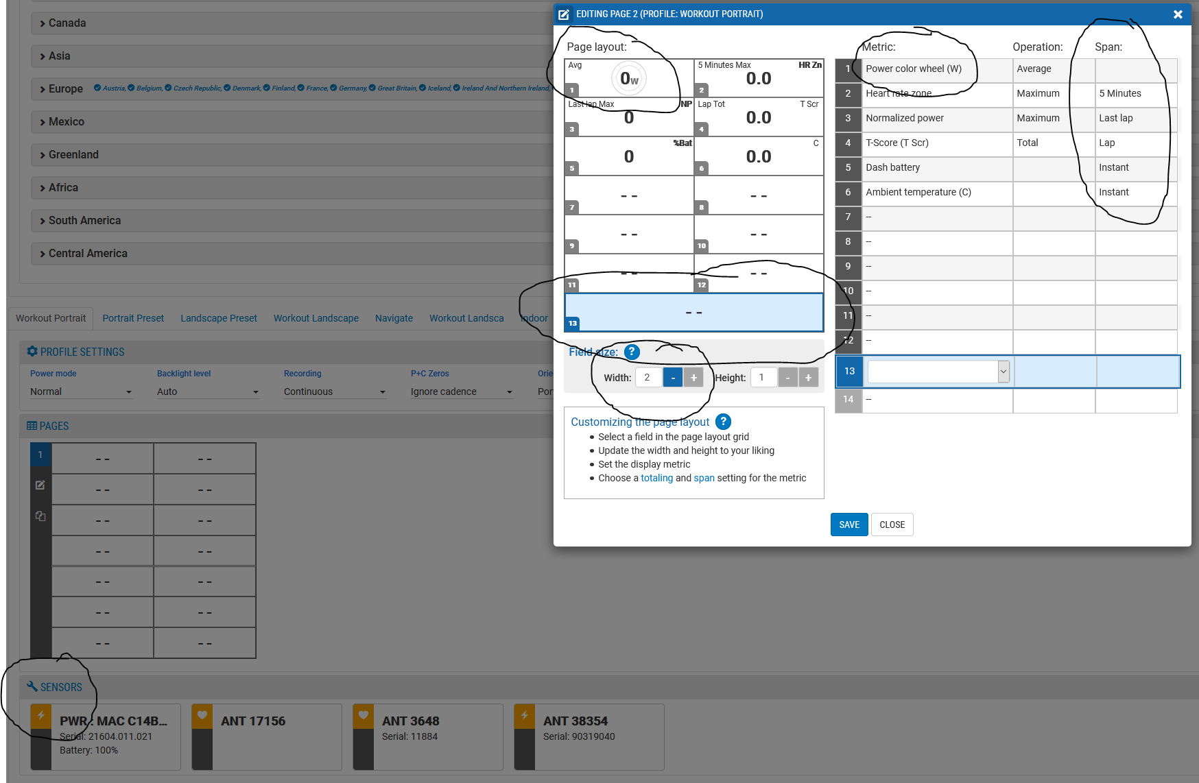 Let’s revisit a ride profile from a different perspective by looking at one edited on the web. Just like what’s found on the app, it’s fully configurable and I’ve circled some of the more interesting aspects of what is available. First up you can see that the sensors can be made available to specific profiles. Then you can see the OPERATION and SPANs applied to some metrics, and I’ve circled the POWER COLOR WHEEL (watts) which is a special kind of graphical metric. I’ve also circled the FIELD SIZE area of the screen which allows you to enlarge any individual metric on the page.