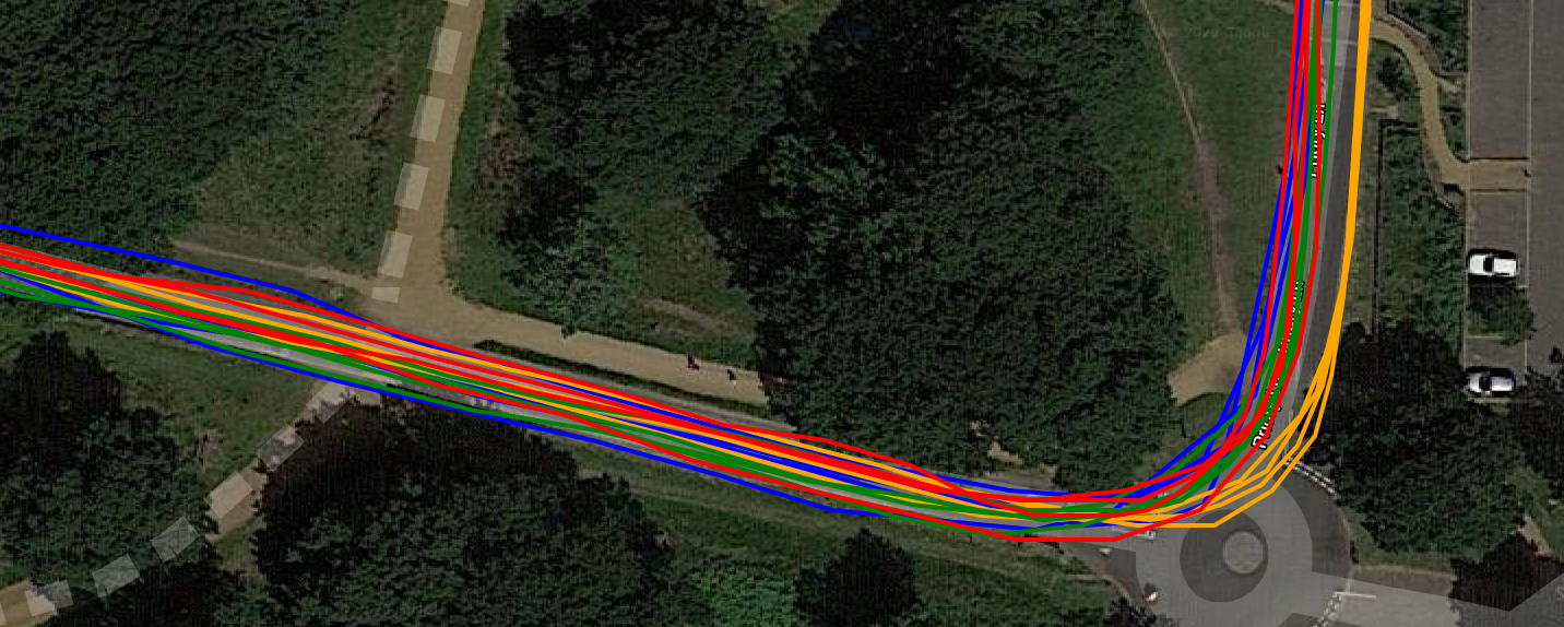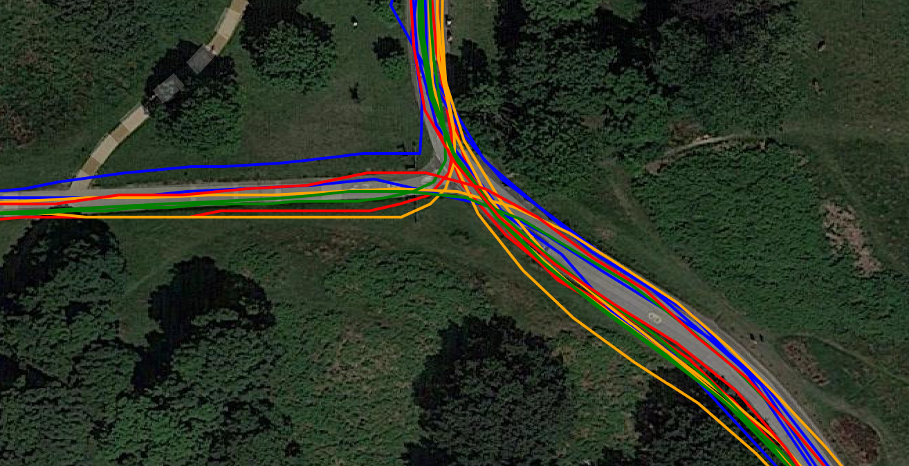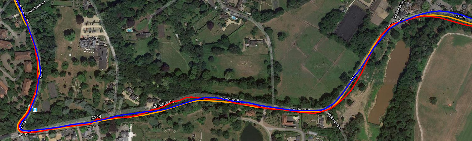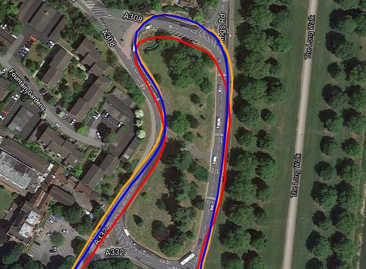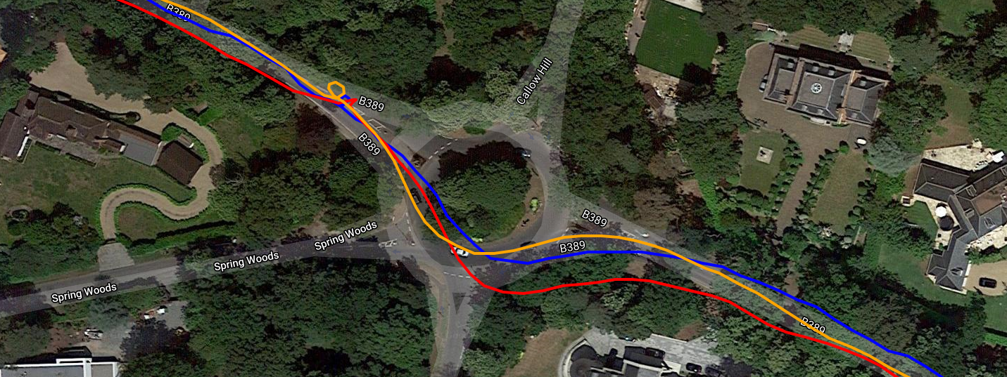 Similarly at the circle/roundabout 1km further to the South East the multiple passes again show the Dash to be consistently good enough. With the 945 (yellow) trying really hard to get into the car park for a rest (on the right).